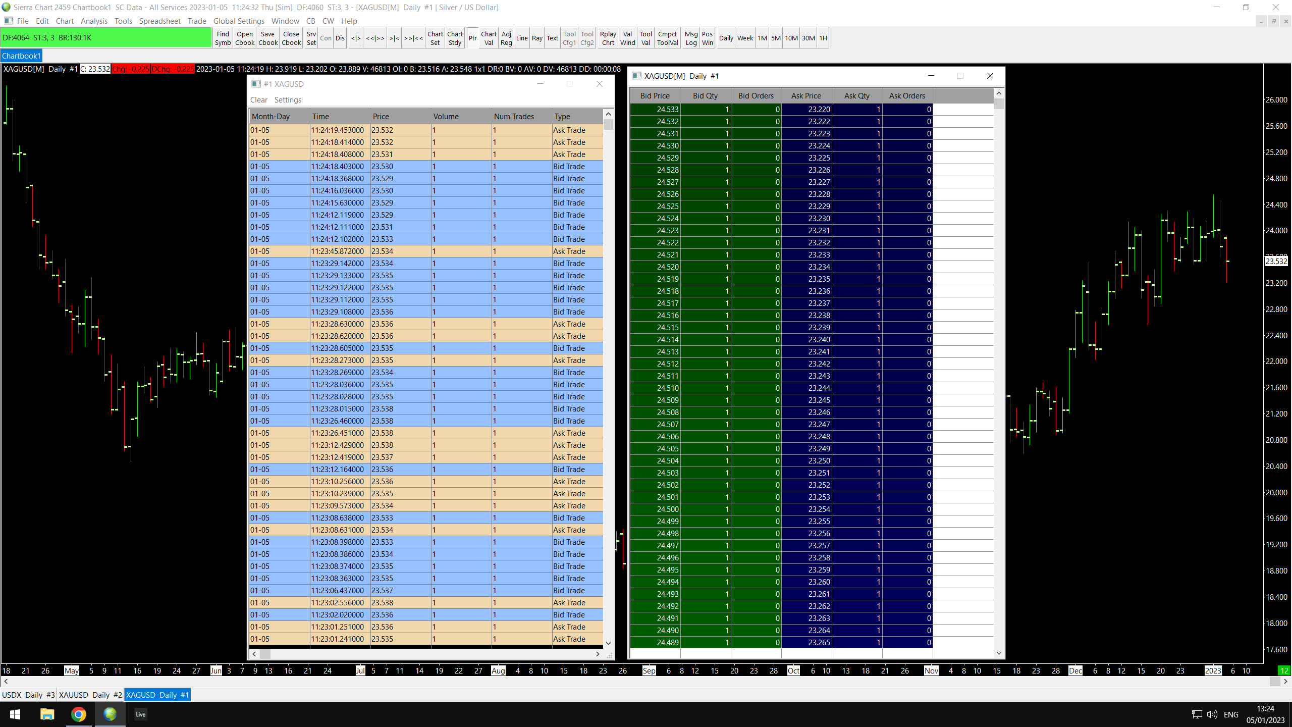 For market depth data you need to use futures data. Use the delayed data feed for now: Delayed Exchange Data Feed Sierra Chart Support - Engineering Level Your definitive source for support. Other responses are from users. Try to keep your questions brief and to the point. Be aware of support policy: https://www.sierrachart.com/index.php?l=PostingInformation.php#GeneralInformation For the most reliable, advanced, and zero cost futures order routing, use the Teton service: Sierra Chart Teton Futures Order Routing |