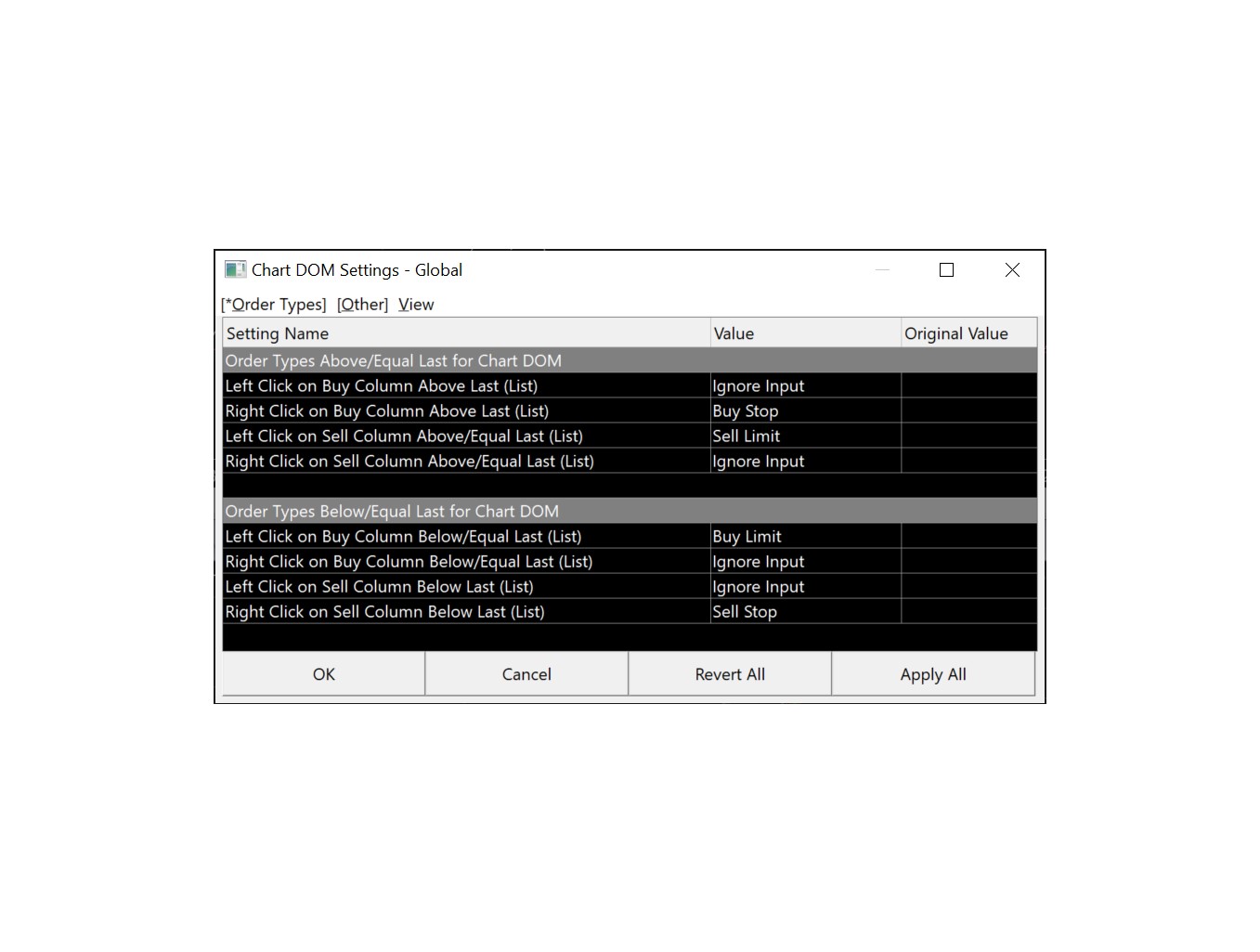 Scott, you might want to separate the Left Clicks for Limit orders only (Buy Limit/Sell Limit), and the Right Clicks for Sell Stop orders only (Buy Stop/Sell Stop) as shown in the attached pic. ChartDOMsettings.jpg These settings will help you to prevent entry errors when adding a pending Limit or Stop entry order above or below current price on the DOM. |