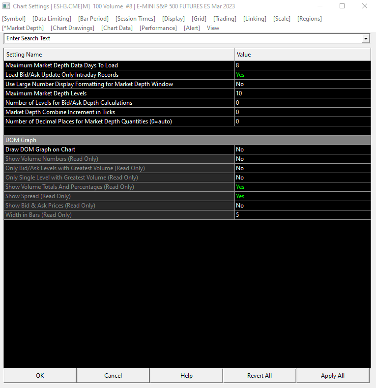 Based upon the screenshot of the file list, you do not have any market depth data for the symbol of the chart. Follow the instructions here to download the market depth data: Market Depth Historical Graph: Downloading Of Historical Market Depth Data Sierra Chart Support - Engineering Level Your definitive source for support. Other responses are from users. Try to keep your questions brief and to the point. Be aware of support policy: https://www.sierrachart.com/index.php?l=PostingInformation.php#GeneralInformation For the most reliable, advanced, and zero cost futures order routing, use the Teton service: Sierra Chart Teton Futures Order Routing |