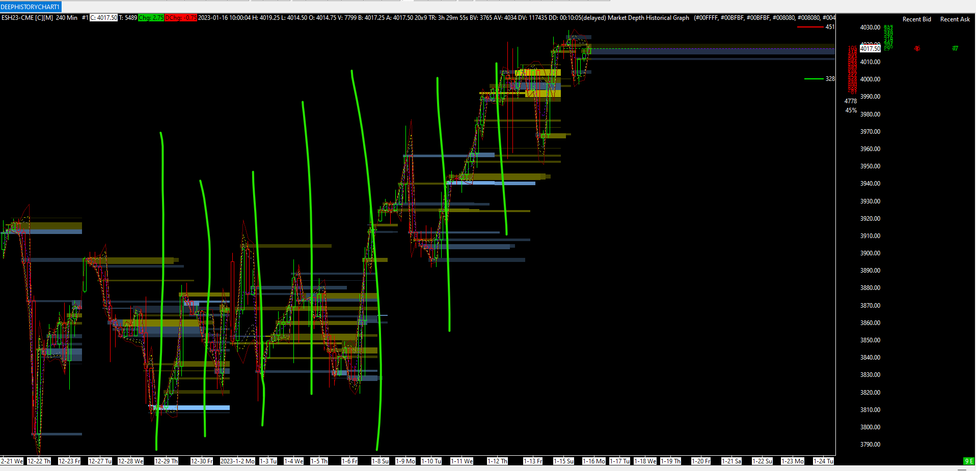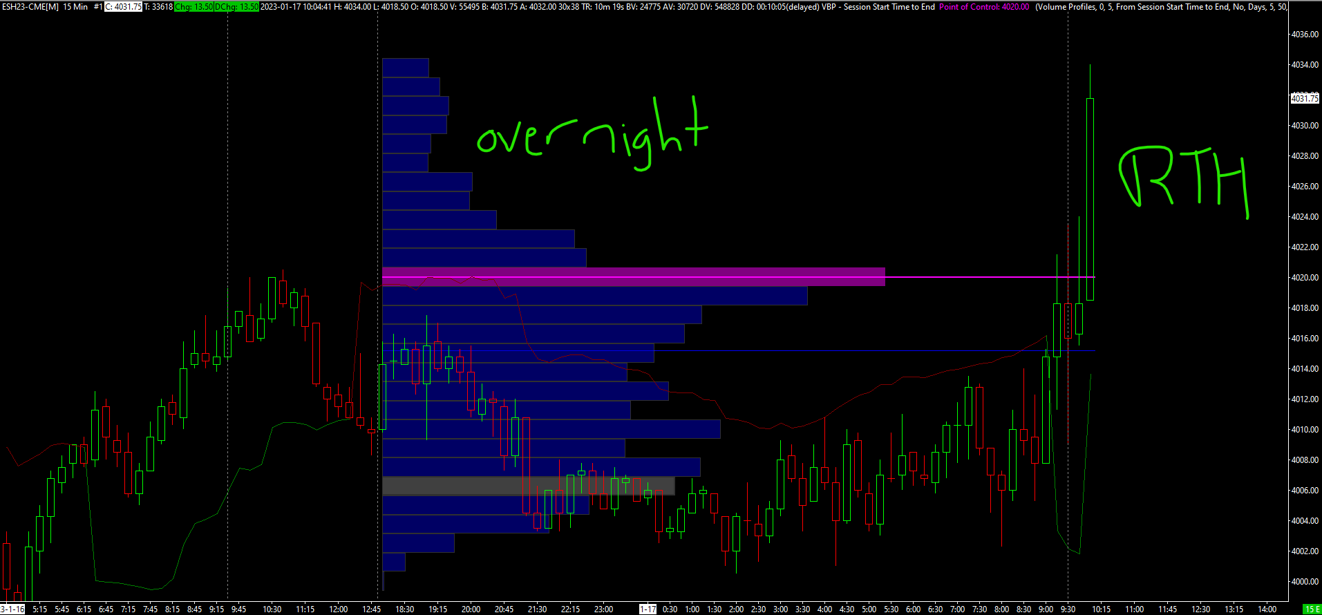 Hi John, I'm hoping to get somewhere close to this style of session division, this is MT5 and studies I bought I use are for a particular style of trading, but I'm wanting to cross over gradually to SC completely by emulating as much as I can on SC before getting some custom work done perhaps. As a start its sessions times, then later emulating more and more of the study set I use on MT5 in SC, they're all just time frame and order flow related, with more advanced studies/custom charts to perhaps be coded later once I have basics in place. Important though I get as close as I can to this (will post separately about the TPO chart on the right hand margin). "EPH23M30.png" For instance, I've set the Vertical Grid up which clearly shows sessions, however I dont seem to be able to VbP to start a new session on the switch over from Overnight Session, to the RTH session. "Sessions Screenshot" Thanks Tim Date Time Of Last Edit: 2023-01-17 15:20:14