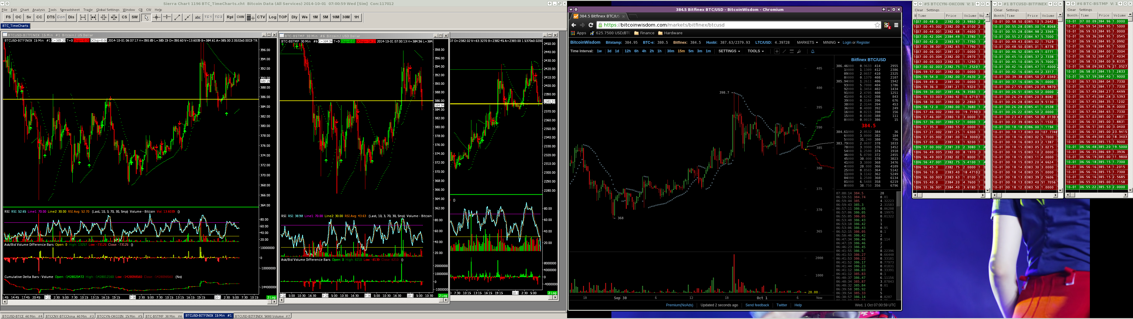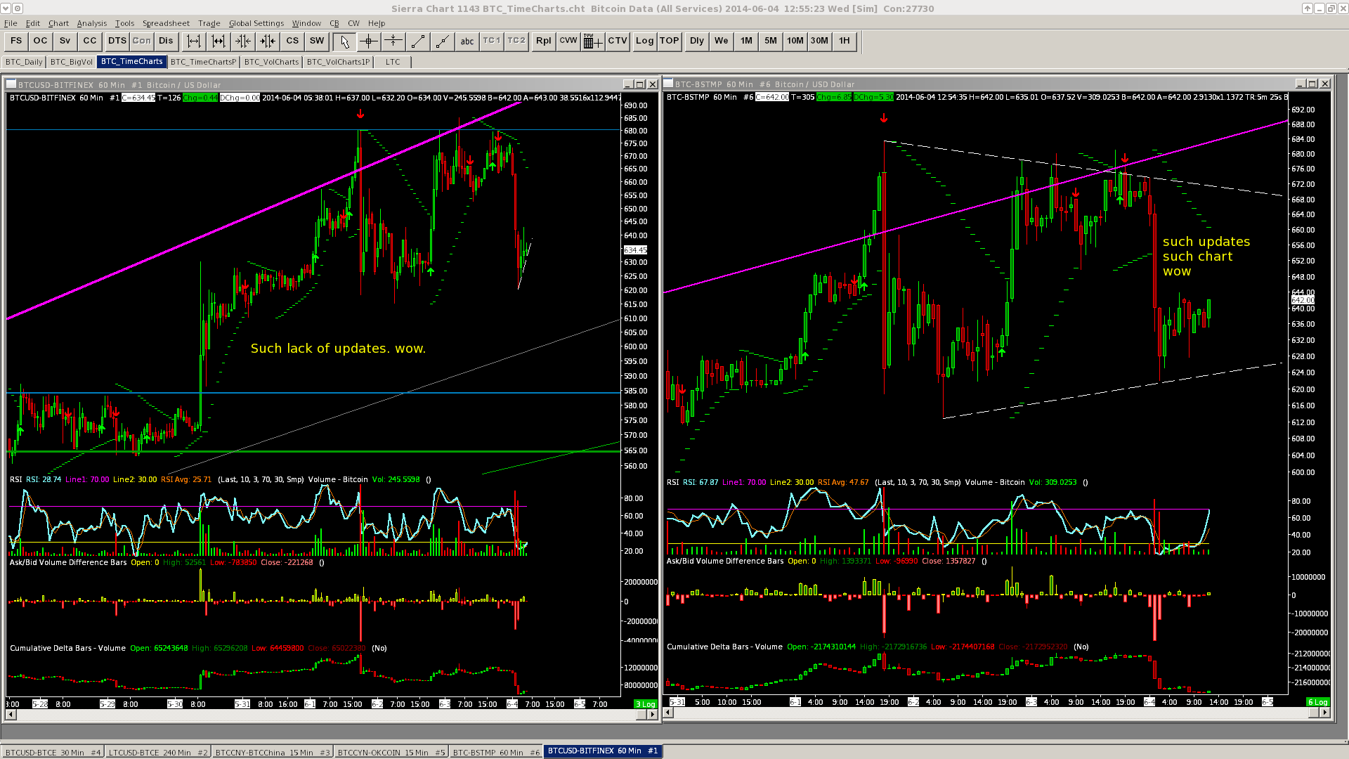 "BTCUSD-BITFINEX" symbol does not appear to be updating and it has not updated for quite a few 60m bars. However the "Market Depth Window" for "BTCUSD-BITFINEX" is happily updating and ticking along, the chart and "Time and Sales" window is not. It should also be noted that BFX recently added a cryptocurrency named DRK and DRK/USD and DRK/BTC pairs which could be added to the Sierrachart Bitfinex feed. |