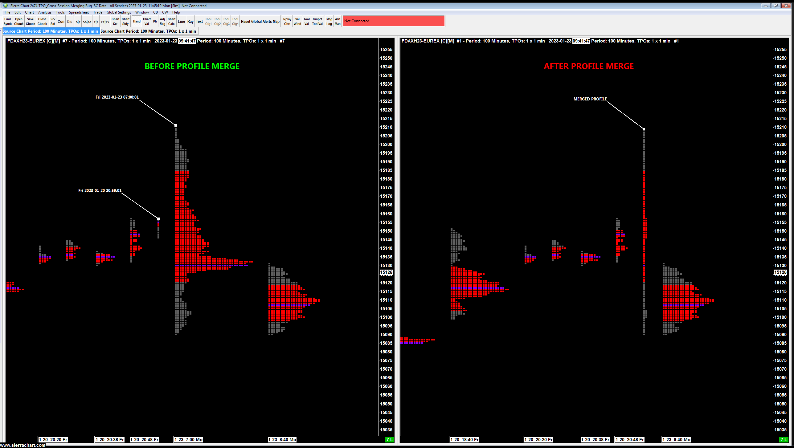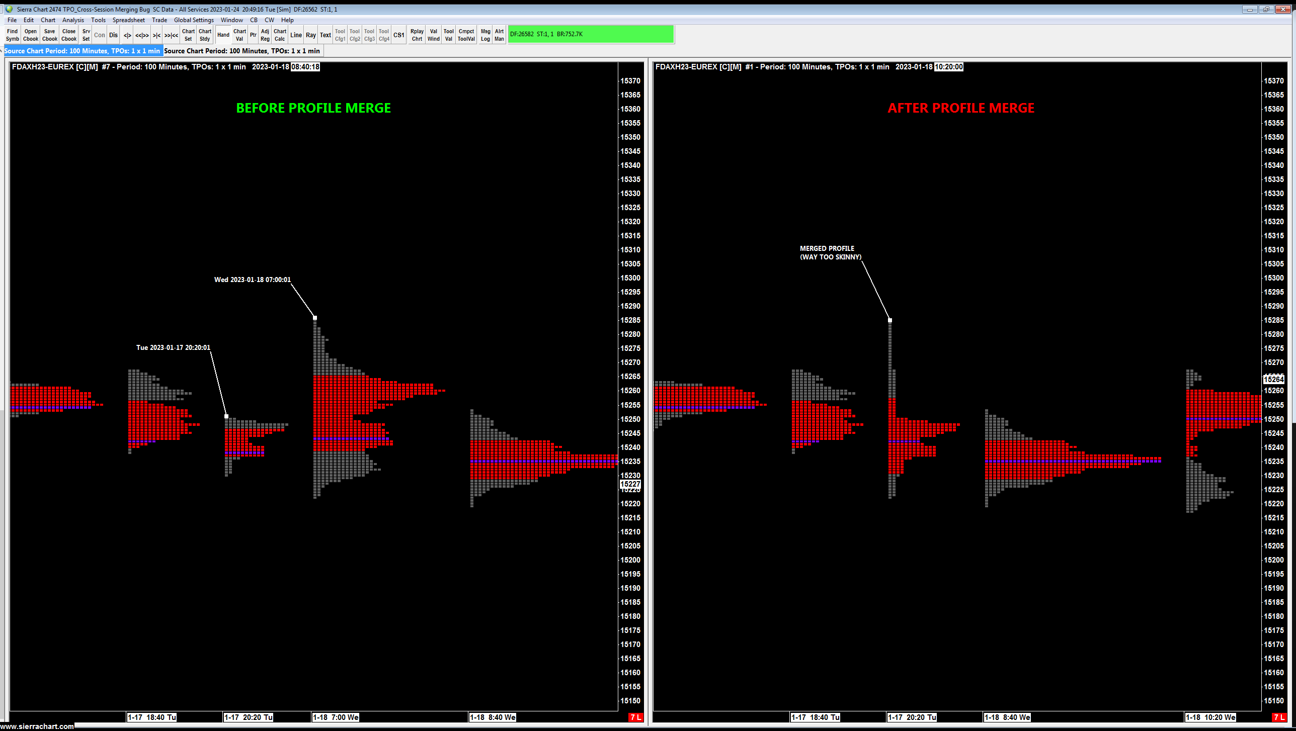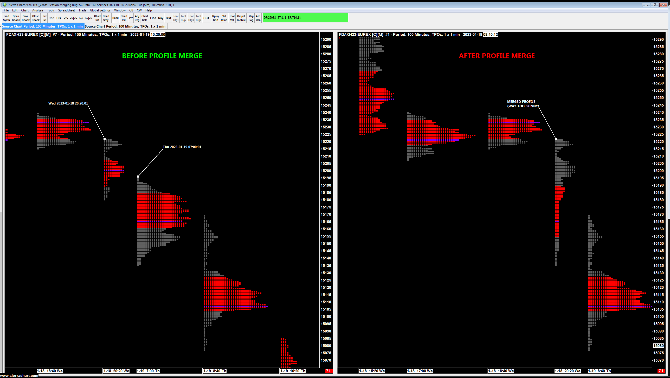 Yes, for the 3 examples marked-up in the Chartbook I sent (and the 2 examples images in my first post), I split the last Profile of each Session (i.e. the Profile immediately before each Profile starting 07:00:01), purely to emphasise the issue. I.E. So each Un-Split Profile prior to each 07:00:01 Profile, started at 20:20:01. The Profile Start Time of 20:20:01 is in keeping with the Profile Time Period Length of 100 Minutes within the TPO Profile Chart Study (i.e. 07:00:01, 08:40:01, 10:20:01 etc. all the way up to 20:20:01) I split these Profiles until the 'last' remaining Profile of each Session started at 20:59:01, and could not be split out anymore. The reason for doing this was purely to emphasise how after merging, the new Profile looks way too skinny. I only did this for the examples labelled. BTW - I've just noticed an error in my labelling of the examples - The Dates and Times are correct, but the Days are not - clearly every example Day is NOT a 'Fri' - Apologies! [This does not affect issue at hand] To find examples where the Profiles remain completely un-split (un-touched if you like), simply scroll back through the Chart I sent to earlier Dates (anywhere back before the Profile beginning Thu 2023-01-19 07:00:01) So, for example merge Profiles Thu 2023-01-19 07:00:01 and Wed 2023-01-18 20:20:01 OR Wed 2023-01-18 07:00:01 and Tue 2023-01-17 20:20:01 (i.e. each example must span different sessions) You should see the same issue. For clarity I have attached before and after merge images where NO Profiles have been split prior to the merge! Example 3: Profiles Thu 2023-01-19 07:00:01 and Wed 2023-01-18 20:20:01: https://www.sierrachart.com/image.php?Image=1674593222545.png Example 4: Profiles Wed 2023-01-18 07:00:01 and Tue 2023-01-17 20:20:01: https://www.sierrachart.com/image.php?Image=1674593359635.png I hope this helps clarify the issue I'm attempting to illustrate. Date Time Of Last Edit: 2023-01-24 20:52:02