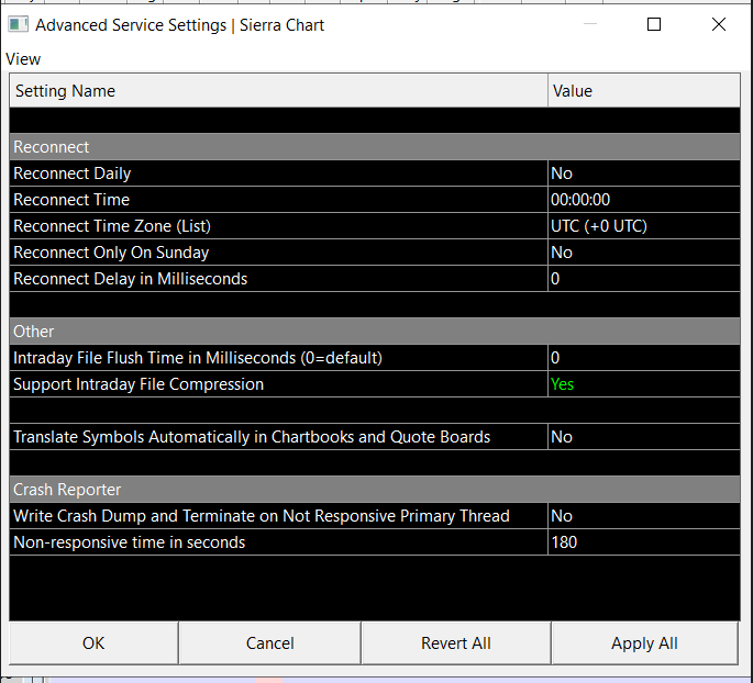 I recently performed a fresh install of Sierra on a new SSD and then logged into the account. I had copied over all the data files and chart files and placed them in the proper data folder. However, now when I open Sierra, my ES charts only show data as current as the time I last logged out. For example, this morning (Wed) I opened Sierra and all my charts only showed data through the close of Friday. I looked in the general settings and found the "reconnect" setting which is currently toggled to "No". I've attached the screen shot of this section. Do I just need to toggle this setting to "Yes" to fix the problem? Currently, if I go into 1 chart and reselect the current ES contract, all the charts refresh properly but I should not have to do this every time I launch Sierra (and never had to in my old installation). Thanks. |