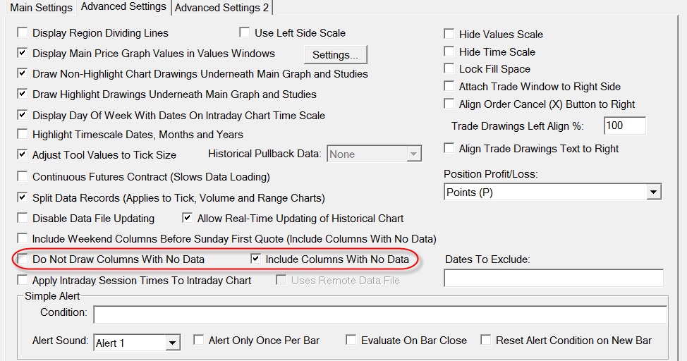 We need to make a correction to what we said previously, this is supported and you have the correct option enabled (Include Columns With No Data). So what exactly is the problem? Saturdays and Sundays are excluded and will not be included in the chart even with this option on. Sierra Chart Support - Engineering Level Your definitive source for support. Other responses are from users. Try to keep your questions brief and to the point. Be aware of support policy: https://www.sierrachart.com/index.php?l=PostingInformation.php#GeneralInformation For the most reliable, advanced, and zero cost futures order routing, *change* to the Teton service: Sierra Chart Teton Futures Order Routing |