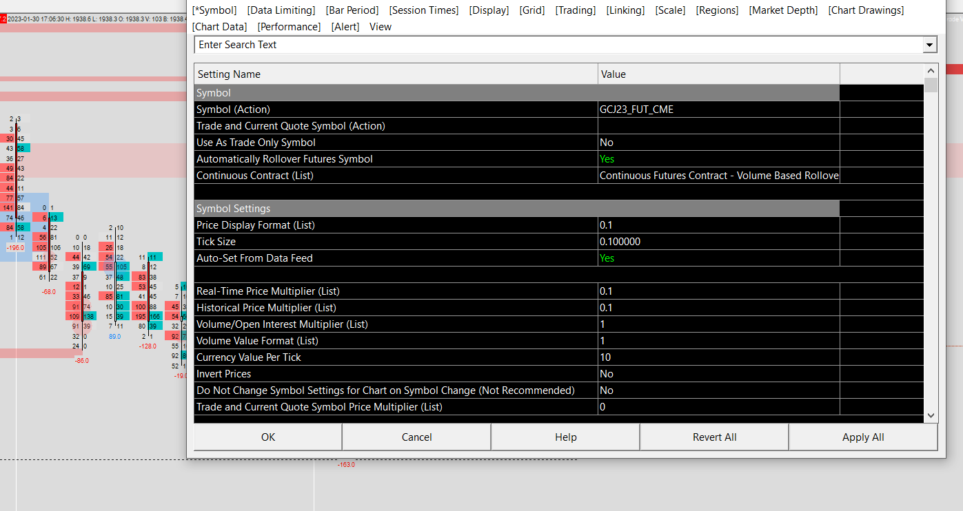 Hi team, I hope you guys have a good day! I am really enjoying trading with Sierra as it provides a number of useless tools! However, I am struggling with volume decimal numbers. For example, in my attached image, the volume for future gold ( I am using continuous future contract - Volume based rollover) and volume always display in .0, like 20.0/ -10.0. Is there any way to make this 20.0 volume become 20 only? as it is unnecessary to have .0 in gold volume and it distracts me from data. I tried "adjust data" function ( from this article Adjusting Data ) but somehow it did not work. After I press OK (I only change Volume multiplier from 1 to 10), volume displays still as 20.0. When I reopen "Adjust data" window again, I saw that volume multiplier turned back to 1 again. Please kindly help me in this case Thank you |