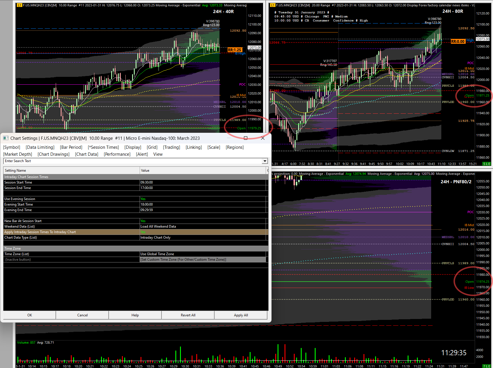The problem is that you have your Session Times and your Horizontal Line at Time set differently. Your Session Times start at 08:30 but you have the Horizontal Line at Time set to 09:30. Since one of the charts is a Range chart, there may not be an exact 09:30:00 bar, therefore the Horizontal Line at Time is going back to a previous day to try and find a bar that fulfills the requirement. This then gives you different prices for what you have listed as the Open. For the most reliable, advanced, and zero cost futures order routing, use the Teton service: Sierra Chart Teton Futures Order Routing |