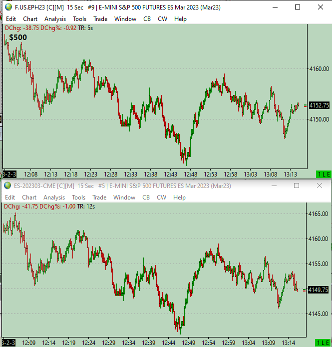 See https://www.sierrachart.com/Download.php?Folder=SupportBoard&download=75927 Have Sierra data feed. You can see the [M] sign in both charts 1st Sierra instance: top chart: CQG routing; I do also have CQG data subscription 2nd Sierra instance: bottom chart: IB routing; I do also have IB data subscription You can see the top chart is lagging. If I connect / disconnect, it catches up, then starts lagging again. Why is this? Date Time Of Last Edit: 2023-02-03 19:23:05