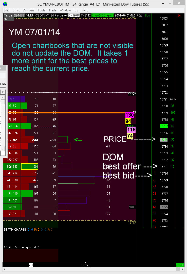 I have 5 chartbooks open. One of the main charts has an active ChartDOM showing 10 levels of depth. When I switch away from an active Chartbook, that ChartDOM will no longer update on that chart. If I return to that Chartbook in 10 minutes, the ChartDOM is in the last place I saw it even though price has moved away. It will take another trade for the ChartDOM to move to the location of Best Price. This started happening just after SC v1000 and it didn't bother me until now... Now I have audio alerts tied to Big Bid resting on Best Bid and Big Offer resting on Best Offer... and the audio alerts don't go off on any Chartbook except the currently visible Chartbook. I figured you were doing it to save bandwidth... for example: minimized ThinkorSwim charts do not update in the same manner. Date Time Of Last Edit: 2014-06-30 18:17:22