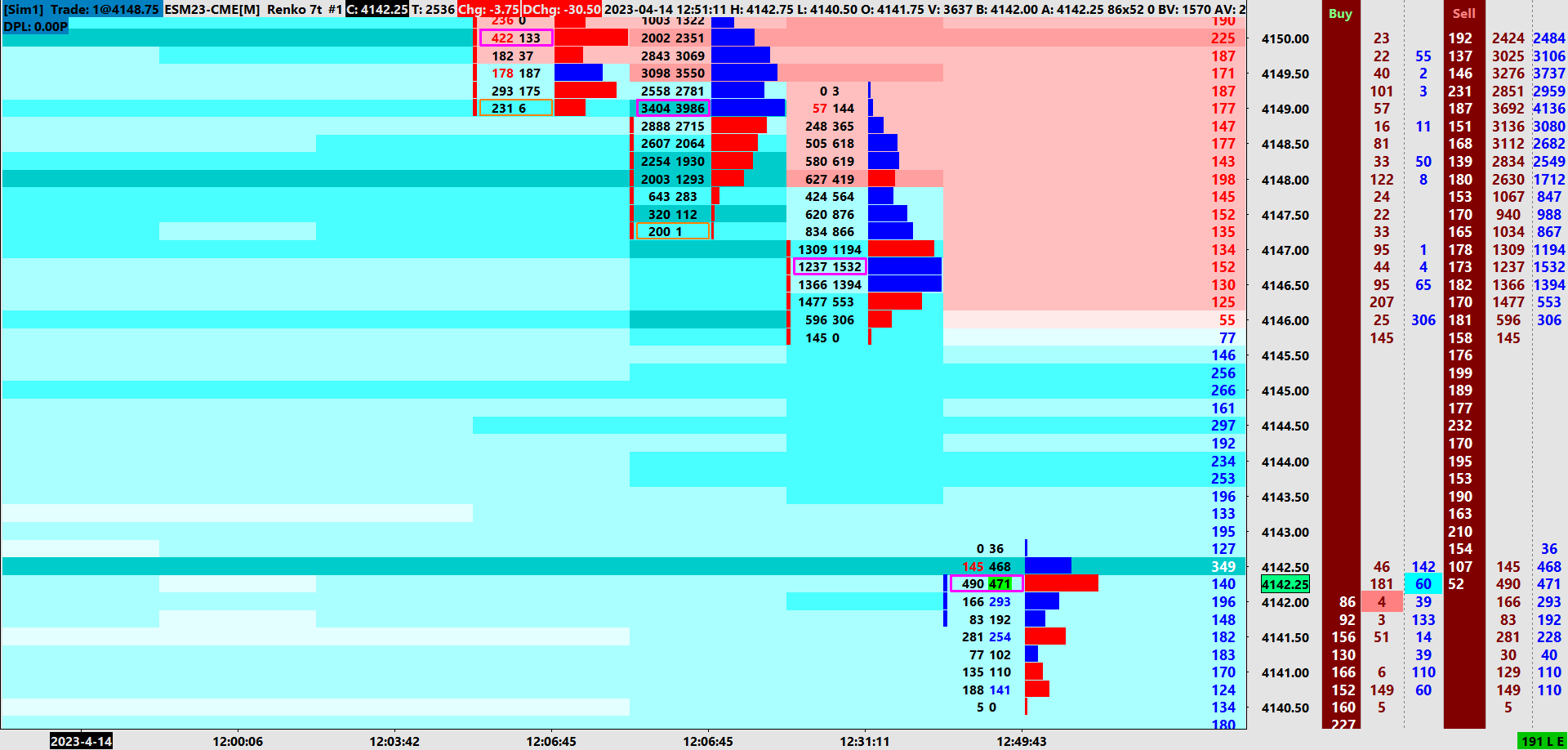 Hi John, Sierra Chart Please see my DOM MDHG discrepancies (Chartbook 6) and my screen image pertaining to this time. The problem is that the market is trading around the 4142 level and the limit orders above and belo are bids (in blue) so not sure, strange! I hope this helps. Thank You. Kind Regards Stephen |