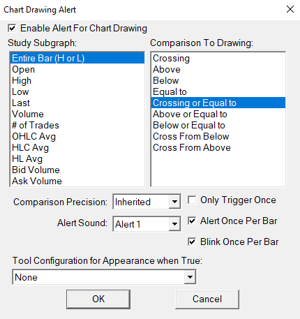 Everything looks fine with the setup. Have you looked in the Window >> Alert Manager to see if the alert is listed in there when you think it should be "True"? If the alert is properly logged, then the issue is that you are not hearing the alert for which refer to the following: General Settings Window: Troubleshooting for Alert Sounds That Do Not Play If the alert is not showing in the log, then the condition must not be true. In this case, you have the "Entire Bar" crossing or equal to the drawing. Be sure you have the entire bar crossing and not just one part of it. For the most reliable, advanced, and zero cost futures order routing, use the Teton service: Sierra Chart Teton Futures Order Routing |