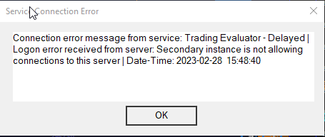 The session times are fine. I set the Current Selected Service to : Trading Evaluator from (delayed) and the charts freeze for 10 minutes and then they start moving delayed 10 min, even though I set the Service from Delayed [trading] to [trading]. It's not session times. I get the attached notice every session when using the Trading Evaluator |
