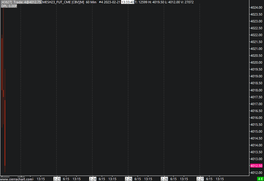 sierra is doesnt loding tht data from the MES instrument . but the NQ data are display Software version: 2479 64-bit | 2023-02-21 17:25:54.335 Primary Thread ID: 11388 | 2023-02-21 17:25:54.335 Usage end date: 2023-07-20 | 2023-02-21 17:25:54.335 Enabled for: Advanced Features 2. | 2023-02-21 17:25:54.335 Enabled for: Sierra Chart Historical Data Service. | 2023-02-21 17:25:54.335 Enabled for: Denali Real-Time Exchange Data Feed. | 2023-02-21 17:25:54.335 Enabled for: Delayed Denali Exchange Data Feed. | 2023-02-21 17:25:54.335 Enabled for exchange2: CME | 2023-02-21 17:25:54.335 Enabled for exchange2: CBOT | 2023-02-21 17:25:54.335 Enabled for exchange2: fairx_exchange.data | 2023-02-21 17:25:54.335 Allow Support for Sierra Chart Data Feeds is enabled. | 2023-02-21 17:25:54.335 Current selected Data/Trading service: Teton CME Order Routing | 2023-02-21 17:25:54.335 Custom symbol settings values: disabled | 2023-02-21 17:25:54.335 Chart Update Interval: 100 | 2023-02-21 17:25:54.335 Intraday Data Storage Time Unit: 0 | 2023-02-21 17:25:54.335 Time Zone: +00:00:00 (UTC+00) | 2023-02-21 17:25:54.335 2023-02-21 17:25:54 Local computer time in UTC | 2023-02-21 17:25:54.335 2023-02-21 17:25:54 Local computer time in SC Time Zone | 2023-02-21 17:25:54.335 2023-02-21 17:20:13 Server time in UTC | 2023-02-21 17:25:54.335 Local computer UTC time and Server UTC time difference: 0 seconds. | 2023-02-21 17:25:54.335 Program path: C:\SierraChart\ | 2023-02-21 17:25:54.335 Data Files path: C:\SierraChart\Data\ | 2023-02-21 17:25:54.335 OS Version Number: 10.0 | 2023-02-21 17:25:54.335 Locale Setting: C | 2023-02-21 17:25:54.335 DLLs: UserContributedStudies.dll, UserContributedStudies_64.dll | 2023-02-21 17:25:54.337 Allowed protected custom studies: | 2023-02-21 17:25:54.337 Crash reporter started: true | 2023-02-21 17:25:54.337 Reloading all Intraday charts in active chartbook. | 2023-02-21 17:25:57.463 MESH23_FUT_CME[M] #3 | Reloading chart. | 2023-02-21 17:25:57.468 MESH23_FUT_CME[M] #3 | StartDateTimeForLoadingOrderFills: 00:00:00 | 2023-02-21 17:25:57.469 MESH23_FUT_CME [CBV][M] 3 Min #2 | Reloading chart. | 2023-02-21 17:25:57.503 MESH23_FUT_CME [CBV][M] 3 Min #2 | StartDateTimeForLoadingOrderFills: 2023-02-07 12:25:57 | 2023-02-21 17:25:57.525 MESH23_FUT_CME [CBV][M] 60 Min #4 | Reloading chart. | 2023-02-21 17:25:57.534 MESH23_FUT_CME [CBV][M] 60 Min #4 | StartDateTimeForLoadingOrderFills: 2023-02-07 12:25:57 | 2023-02-21 17:25:57.556 MNQH23_FUT_CME[M] 5 Min #6 | Reloading chart. | 2023-02-21 17:25:57.579 MESH23_FUT_CME [C][M] 10 Sec #1 | Reloading chart. | 2023-02-21 17:25:57.584 Loading market depth data. | 2023-02-21 17:25:57.590 Loaded depth data records for MESH23_FUT_CME 2023-02-21 from 2023-02-21 12:06:22.781000 to 2023-02-21 12:25:55.450000. | 2023-02-21 17:25:57.612 Reloading all Historical Daily charts in active chartbook. | 2023-02-21 17:25:59.924 MESH23_FUT_CME [CBV][M] Daily #7 | Reloading chart. | 2023-02-21 17:25:59.947 |