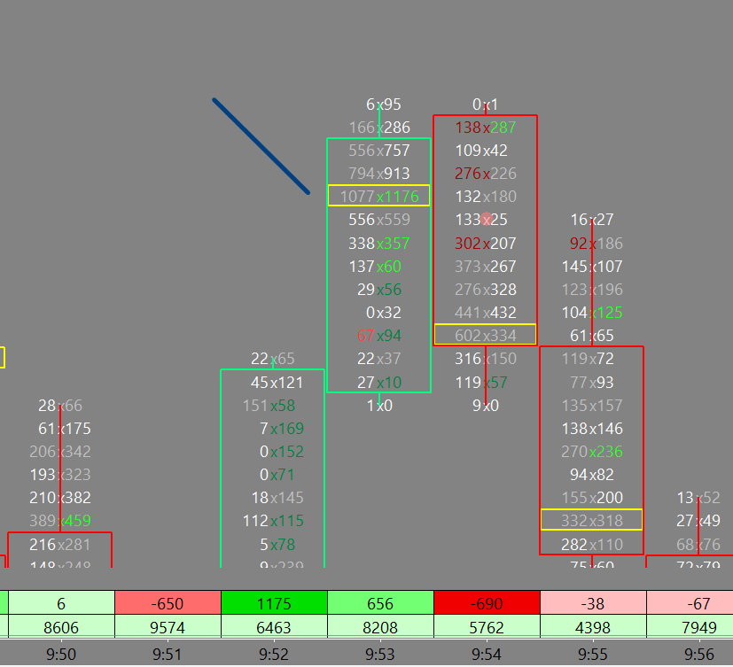 There is not a way to do this using the Numbers Bars Candle display. But, if you setup the Main Price Graph to be a Candlestick Hollow then you can use the Study Price Overlay to overlay the Main Price Graph onto the Numbers Bars, which will look the same as what you have now. Then you can use the Color Bar Based on Alert Condition to color the bar based on whether the Bid/Ask is above a certain amount. You will need to change the Subgraph Draw Style for the Color Bar to Color Bar Hollow. In terms of setting up the alert condition for the Color Bar Based on Alert Condition, you will have to check each level of the bar individually, and you will have to guess as to how many levels there are within the longest bar you expect. You will then create an Alert condition that looks like the following to check if either the Bid or the Ask is above 1000 for the first two levels starting at the low: =OR(BVAP(L, 0) > 1000, AVAP(L, 0) > 1000, BVAP(L + TICKSIZE * 1, 0) > 1000, AVAP(L + TICKSIZE * 1, 0) > 1000, ...) You will have to add the rest to do the test. Refer to the following for the information on BVAP and AVAP functions: Study/Chart Alerts And Scanning: Special Functions For the most reliable, advanced, and zero cost futures order routing, use the Teton service: Sierra Chart Teton Futures Order Routing |