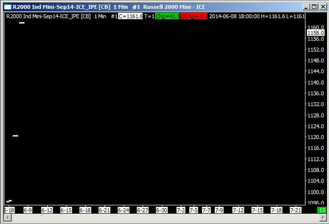 Recently I've been having trouble with Russell 2000 Mini futures charts. Today I rolled over to September and I can't get a proper chart. It's hard to explain what is happening from what I'm seeing. For one thing, the back-adjusted continuous feature doesn't seem to be working at all. I'm using AMP/TTNet with SC RT Data for CME only on Version 1146. I'm not subscribed to the Russell through SC RT. Attached is a chartbook with one intraday TF chart. What other information do you need to help me with this? Edited post and added an image of the chart as it displays on my computer. Another edit: An R2000 TradeDOM is completely blank, not even any grid lines. When I change it back to the June contract, it is still blank. Another edit: I don't seem to be getting any data for the YM September contract from SC RT feed. Another edit: The YM September contract from SC RT feed seems to be working now. Date Time Of Last Edit: 2014-06-12 14:21:47