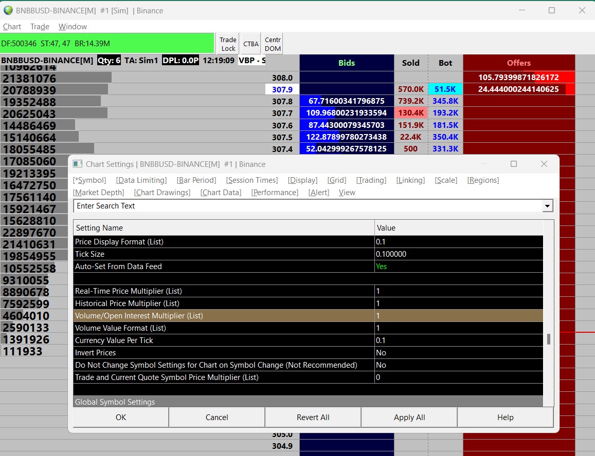 Hello, for symbol BNBBUSD-BINANCE, the bot shows 10,000 when it should show 1, and Sold shows 2,3000 instead of 0,23 for example. I have changed , in Chart -> Chart Settings -> Volume / Open Interest Multipler , and Volume Value Format (List) from 1 to 1/10000, and it does work, but only for the Time and Sales window, and for the Trading Volume column on the left, but the Bot and Sold still shows 10,000 multipled values. Please can you advise how to get this to show correct Bot and Sold values? I have sent the Log for Review, from the application, today. thanks. |