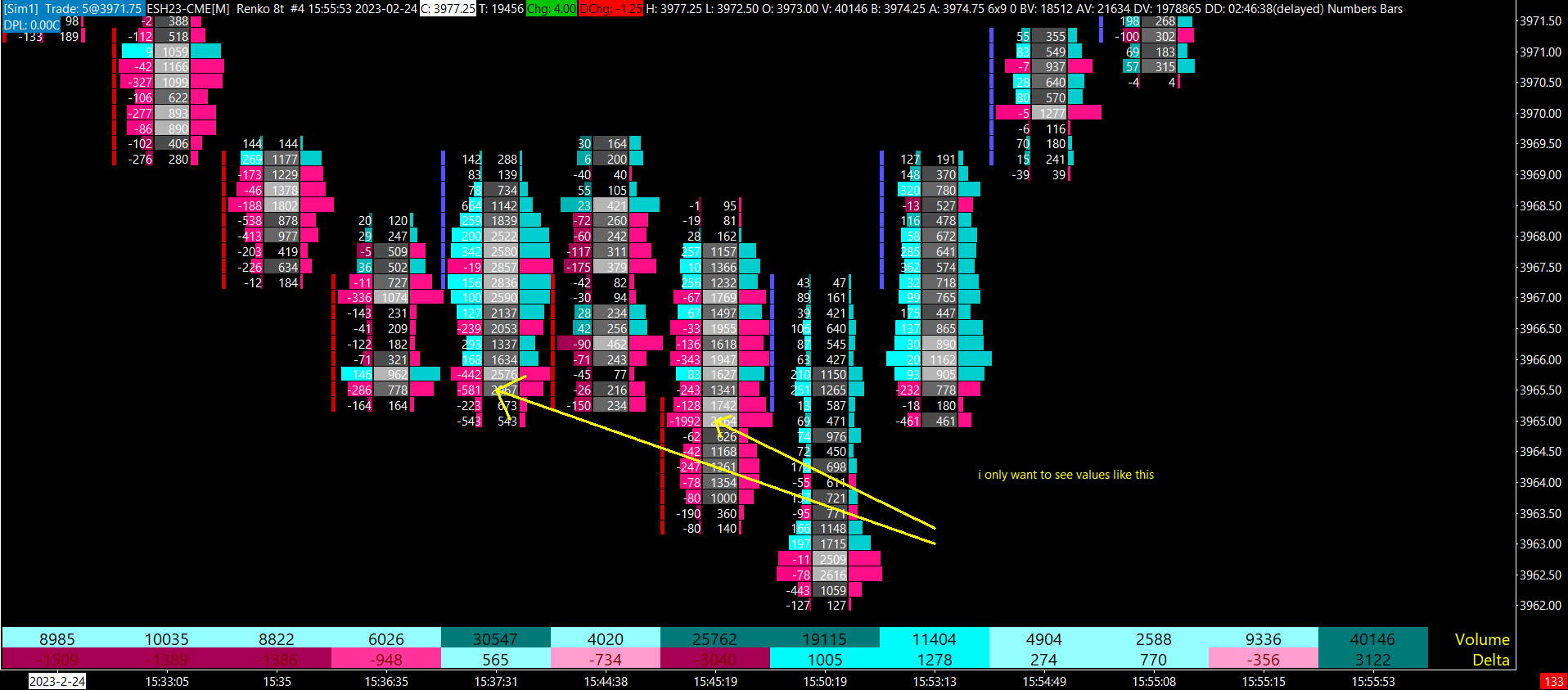I attempted to recreate a trader's chart but encountered an issue only with the first column Although the indicator assigned importance to all delta values, I only want the high delta values to be clearly highlighted I want to emphasize only the significant values (Delta) and disregard the smaller ones to visualize absorption better I suspect this issue is related to the compare threshold setting, I tried adjusting the compare threshold to different values, but there was no change in the outcome. I wish to recreate the initial image, whereas the second one depicts my own creation. Could you please assist me with this? Date Time Of Last Edit: 2023-02-25 00:48:40