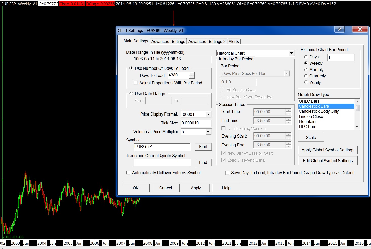 this looks like a problem with the application. i have installed a new package for this test. running win7 64bit sc ver 1146. my broadband has got issues and running at snails pace today so i couldnt do everything needed. i have uploaded two screen shots.first one is of a weekly chart, the chart setting window is open and you can see everything. i have put a green vertical line at the beginning of chart to show the last day which is 2002 which is same as days to load but the data range is from 1993. this is just after a delete/download process. other one is of 4hr chart; last day is 2013-12 and so does the data range start from 2013-12 but number of days to load are set at 750. again deleted and downloaded the datafile but same thing happens. |