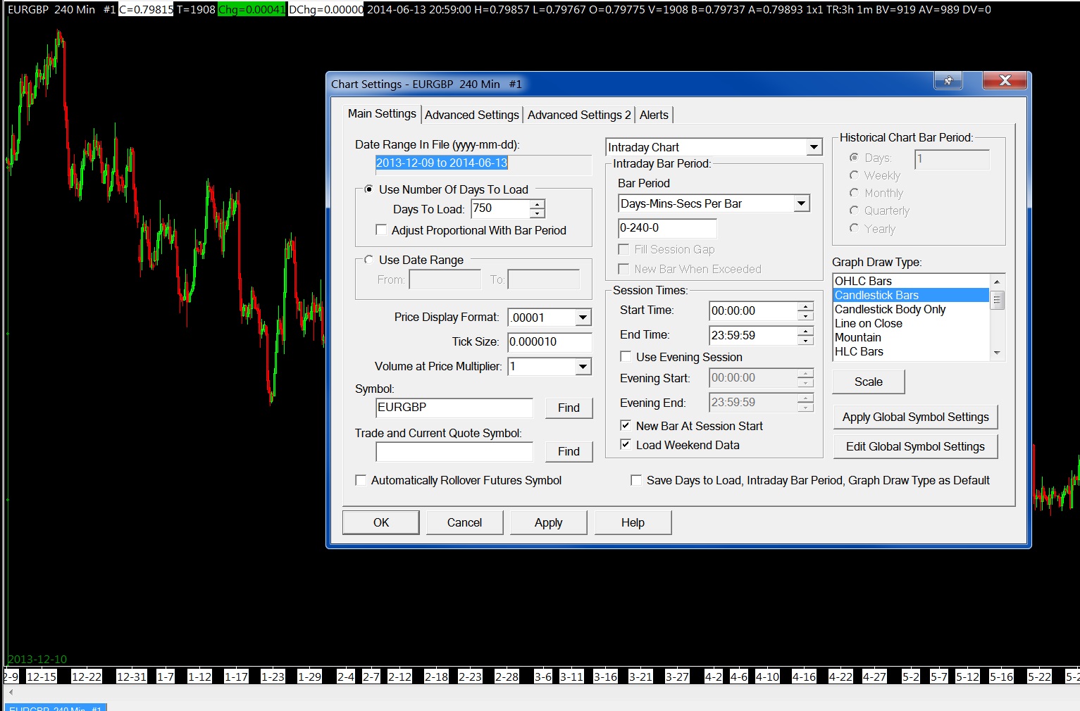 i keep changing setting on my chart to have 750 days of intraday data available/loaded, have deleted data files, re download them etc. somehow(and i dont know how)sometime i seem to get them sort of working but only and immediately and within the same session i do the following: -set the days go back to a higher number(ie 1500 not 750) -delete and download but all when that session is active. upon exit and restart the application again, it goes back to only displaying data starting 2013-12-8 'til now. although days go back is still 750! what am i doing wrong? |