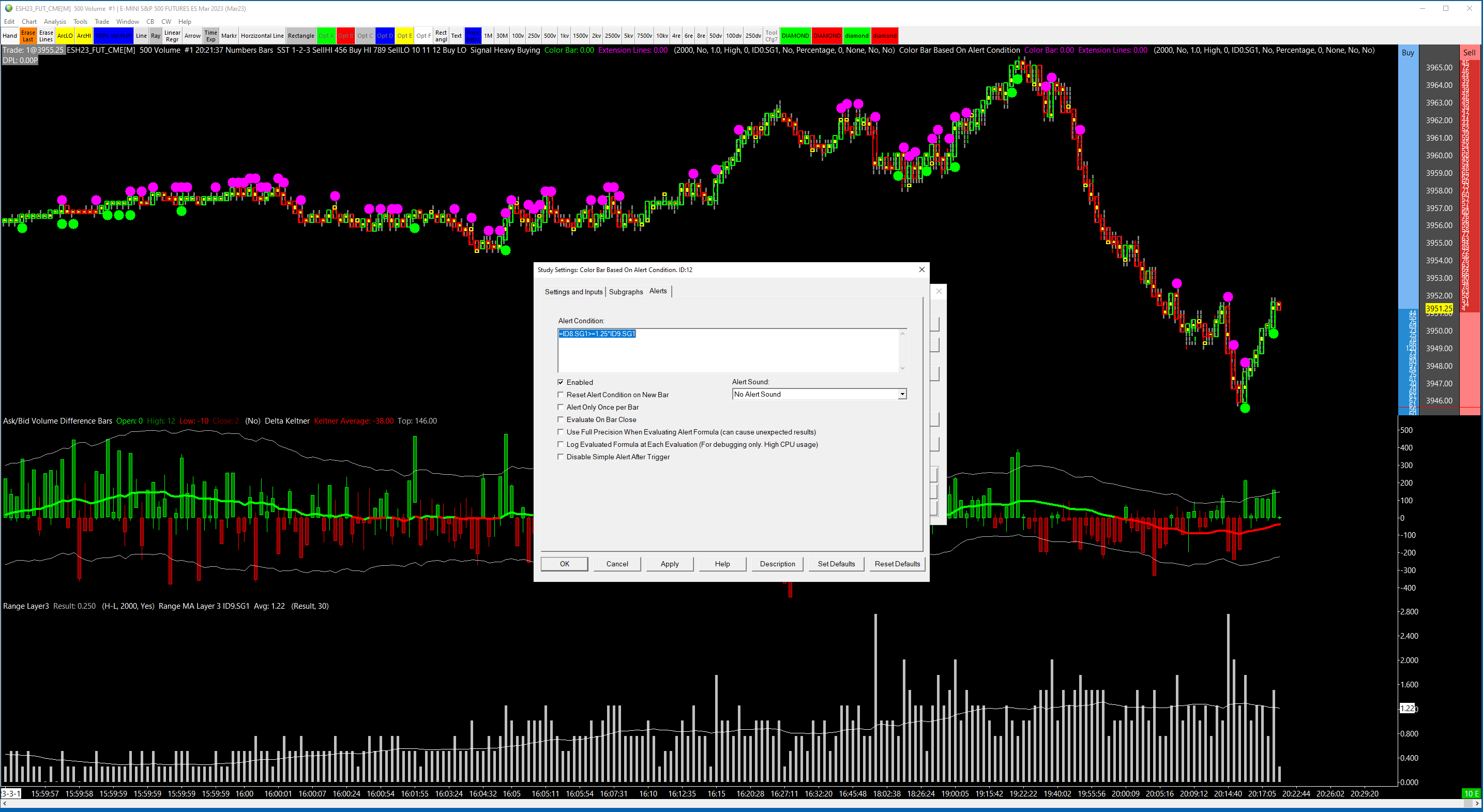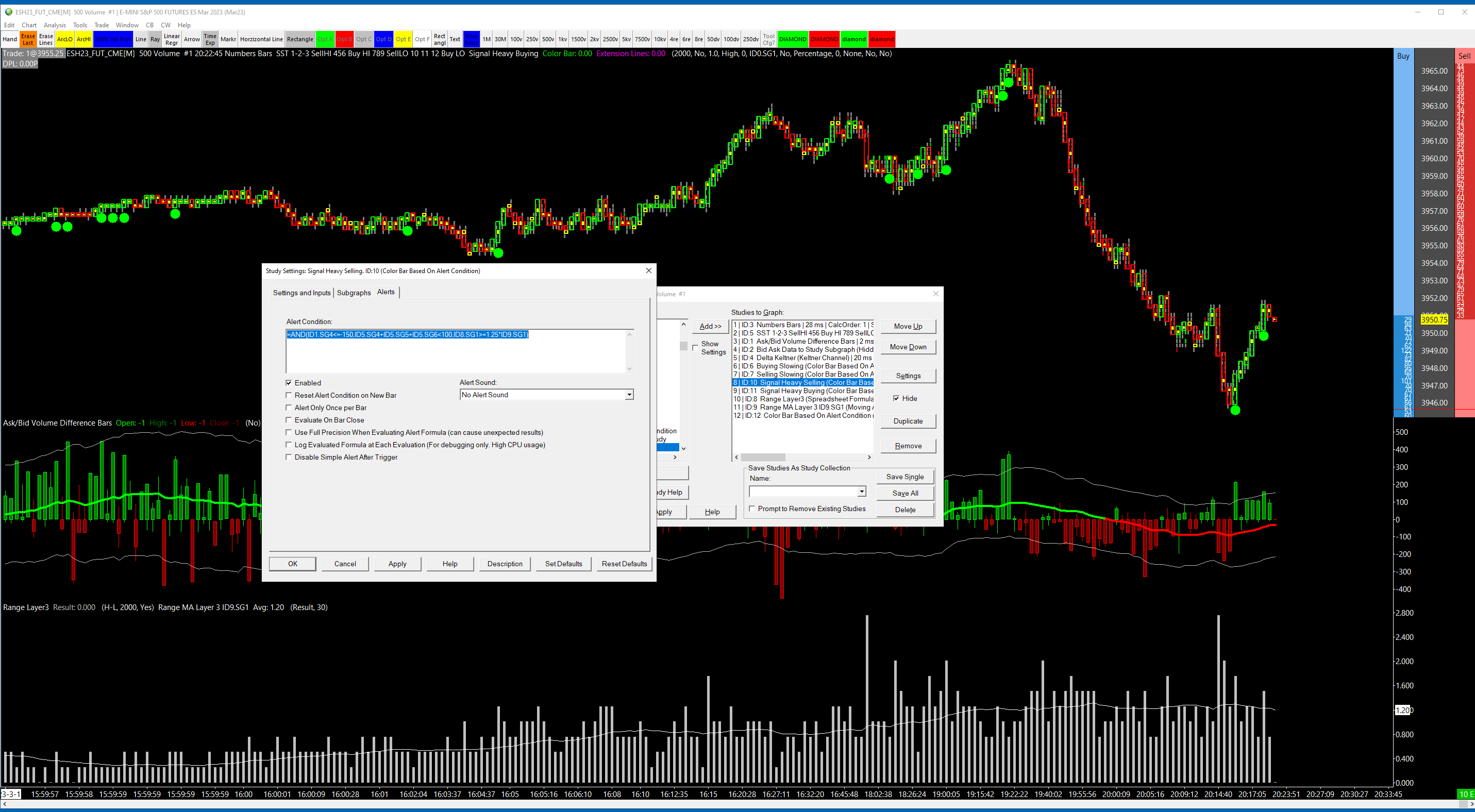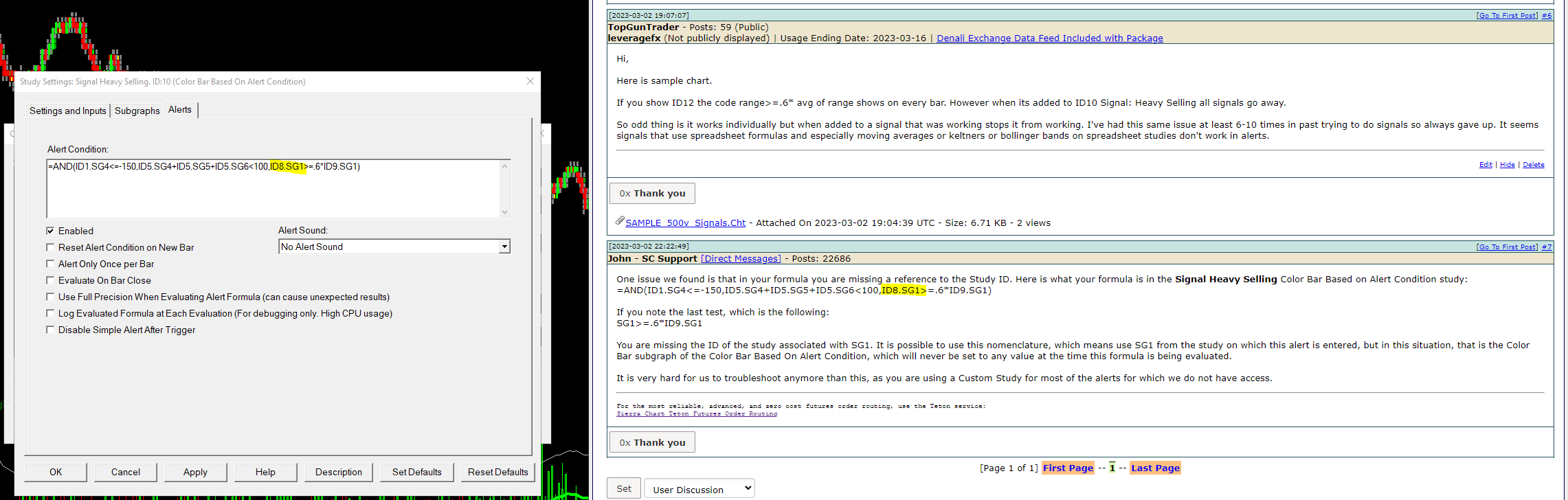 One issue we found is that in your formula you are missing a reference to the Study ID. Here is what your formula is in the Signal Heavy Selling Color Bar Based on Alert Condition study: =AND(ID1.SG4<=-150,ID5.SG4+ID5.SG5+ID5.SG6<100,ID8.SG1>=.6*ID9.SG1) If you note the last test, which is the following: SG1>=.6*ID9.SG1 You are missing the ID of the study associated with SG1. It is possible to use this nomenclature, which means use SG1 from the study on which this alert is entered, but in this situation, that is the Color Bar subgraph of the Color Bar Based On Alert Condition, which will never be set to any value at the time this formula is being evaluated. It is very hard for us to troubleshoot anymore than this, as you are using a Custom Study for most of the alerts for which we do not have access. For the most reliable, advanced, and zero cost futures order routing, use the Teton service: Sierra Chart Teton Futures Order Routing |