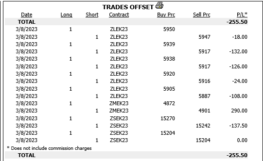 Please, I'm still waiting an answer. I'm in contact with AMP clearing as well asking me news from you. About all this mistakes about my trades on ZLEK23. The Trade Activity log does not match at all my operativity. I never have got this losses through my trades on this symbol. Losses that appear accordingly on the AMP Daily Statements. I don't know if the first overnight position of the 2023/03/07 could had caused that somehow. Please read all my issues and let me know. Thank you again. I'll be waiting for a kind reply. Regards |