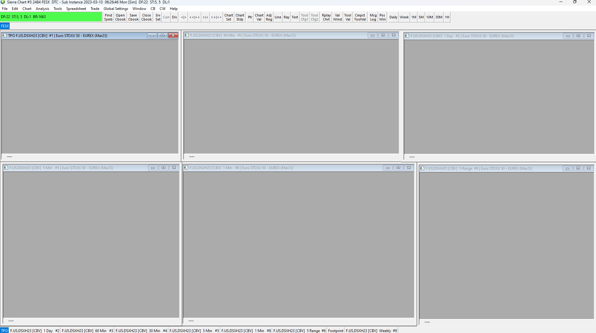 Are the symbols of the charts correct? Refer to: Data/Trading Service Connection and Symbol Issues: 1.3. Symbols Go to one of the charts and select Chart >> Reload and Recalculate. Also refer to: Intraday Chart or Chart Bars Not Updating | Blank Intraday Chart | "Currently no data to display" message for Intraday Chart Sierra Chart Support - Engineering Level Your definitive source for support. Other responses are from users. Try to keep your questions brief and to the point. Be aware of support policy: https://www.sierrachart.com/index.php?l=PostingInformation.php#GeneralInformation For the most reliable, advanced, and zero cost futures order routing, use the Teton service: Sierra Chart Teton Futures Order Routing Date Time Of Last Edit: 2023-03-13 09:20:39