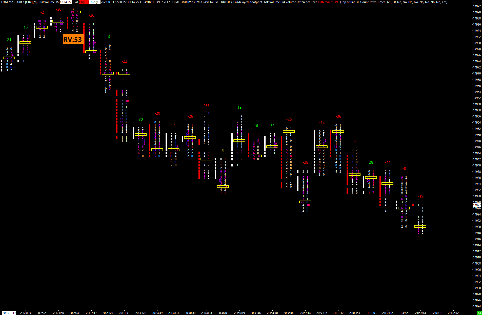 https://www.sierrachart.com/image.php?Image=1679127285822.png I made a link with a study price overlay to have the same information on my graph #1 https://www.sierrachart.com/image.php?Image=167912705139.png in this case it works very well. now here is what my graph#2 gives when I activate the filter exclude <=4 https://www.sierrachart.com/image.php?Image=1679127397263.png and here is what it looks like on my graph#1 https://www.sierrachart.com/image.php?Image=167912749857.png This filter is used to see only orders greater than 5 contracts placed in one go, they appear at the top of the bars. When I put my 2 graphs in tick reversal, in 1 minute it works very well. When I put in candles 100 vol, it does not work anymore, whereas it worked very well some time ago We are very confused as to what exactly you are doing - as you can not use the Study/Price Overlay to overlay the Numbers Bars study. So we are not sure what the relation is between Chart #2 and Chart #1. But, the one thing we can say is that when you filter out trades that are less than or equal to 4 (<=4) then we are not surprised that you are seeing zeros for all the entries. Keep in mind that the Numbers Bars shows the total volume traded at a particular price point. Therefore when you see a value of 5, it does not mean there was a single trade with a quantity of 5, it means that all the trades at the price and time added up to a total of 5. Most likely is that there were 5 trades of 1 each. If you are wanting to see specific large trades, then we recommend using the Large Volume Trade Indicator instead of filtering the Numbers Bars. Refer to the following: Large Volume Trade Indicator For the most reliable, advanced, and zero cost futures order routing, use the Teton service: Sierra Chart Teton Futures Order Routing |