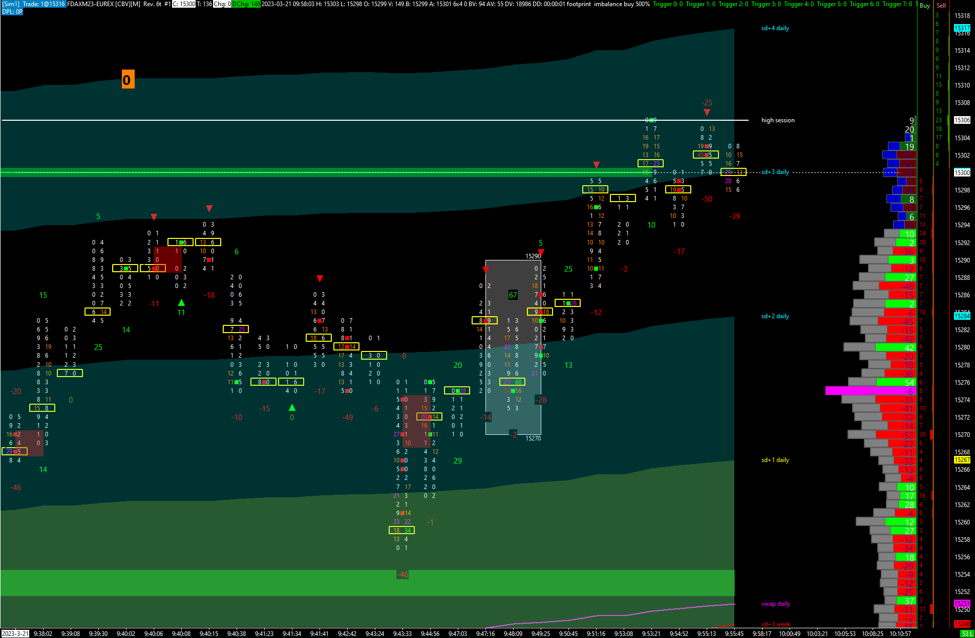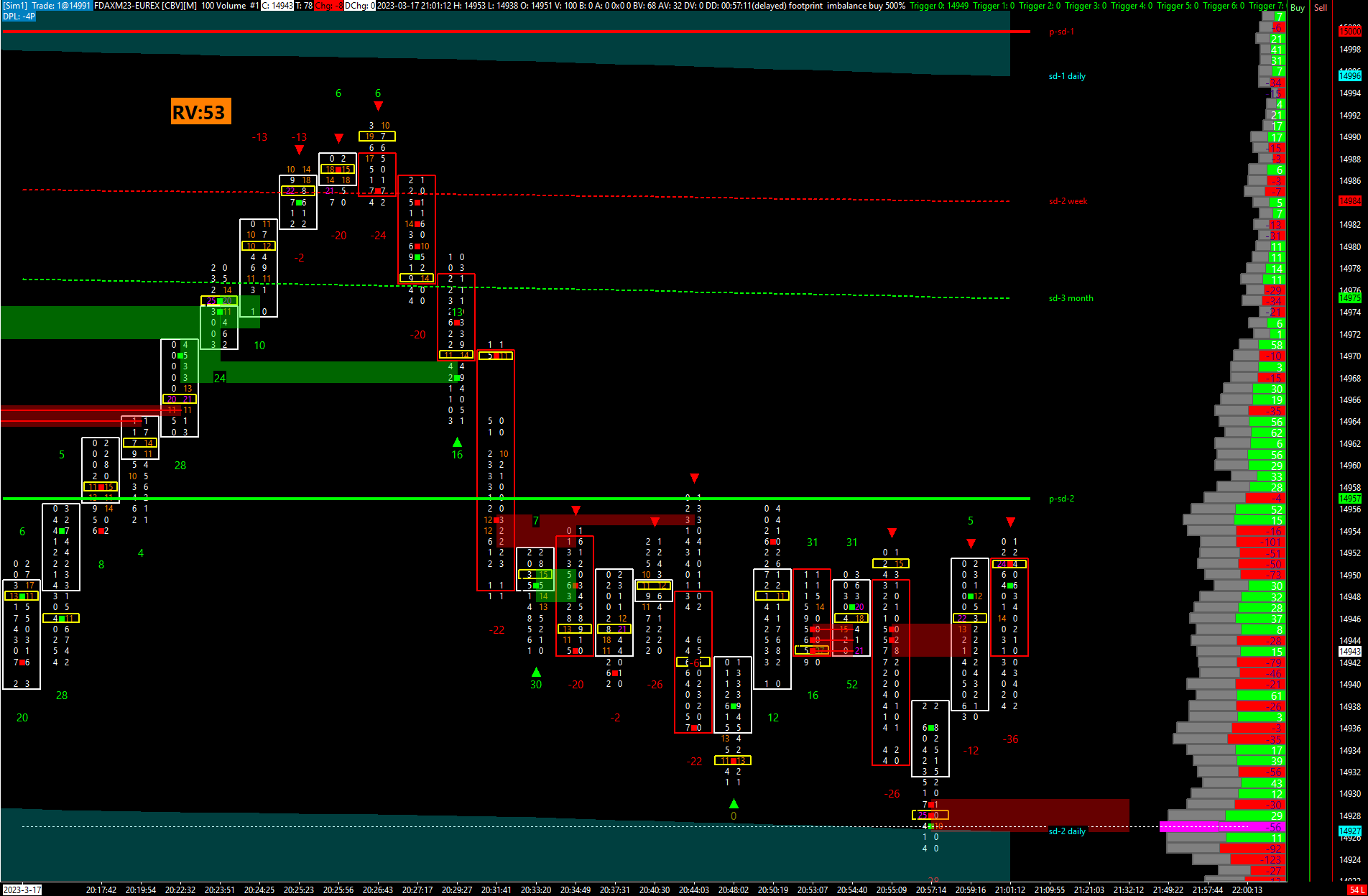 oui je sais que sur le graphique#2 il y a des 0 partout, d'ailleurs je ne le regarde pas. Ce graphique me sert à uniquement à faire apparaitre le nombre de contrats que mets un seul opérateur quand c'est supérieur ou égal à 5 https://www.sierrachart.com/image.php?Image=1679325950306.png le -10 et le -13 entourés signifient qu'un opérateur à posé 10 contrats à la vente en 1 fois, et pareil pour le -13. Ensuite je reporte ce numéro sur mon graphique#1 avec l'étude "study price overlay", et normalement cela doit apparaitre sur mon graph# comme sur mon graph#2 ça marche très bien quand je suis en tick reversal, mais en barres de volumes ça ne marche plus, les chiffres apparaissent n'importe ou |