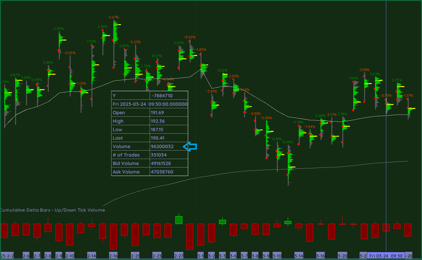 I have noticed the volume totals for stock symbols is quite different when using -NQTV compared to just the symbol alone. For example TSLA on 3/24 shows a daily volume of 96.2 million, where TSLA-NQTV shows 11.87 million for the same day. I would just use the non-NQTV symbol, however cumulative delta does not display correctly when using Intraday data, as shown in the picture, unless NQTV is used.