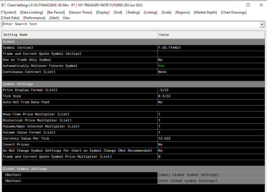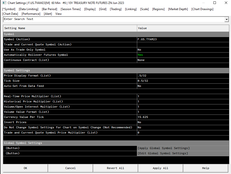 Hi, I have 2 charts here of the 10y bond futures. one is in 2 ticks increments (the black one) and the other one is in 1 tick increments (the lighter one). The symbol settings are the exact same and I don't find a way to put the black one into 1 tick increments. If it's in the study settings then I don't find it. |