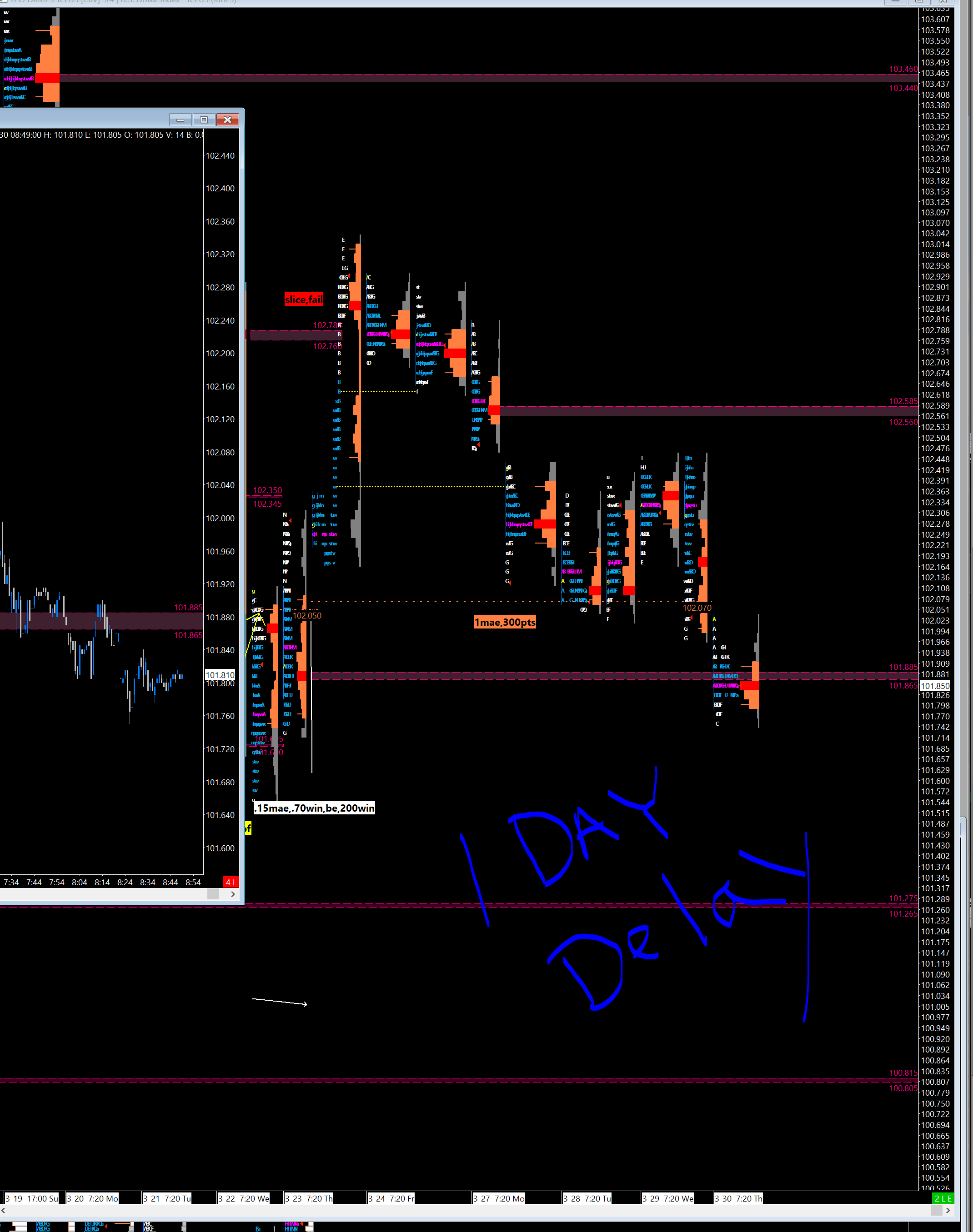John, What I don't get is if you can give me charts on ICE's DX future, albeit 1 full day lag, why can't you support it. Obviously, you have done something so that I get mkt profile charts, time charts etc all fine and dandy. So why then can't we trade it? Looking at all the obscure things you do support I can't believe the dollar index isn't one of them. Thanks, I just don't get how I can see these types of charts attached, yet cannot trade it... sigh Karen Date Time Of Last Edit: 2023-03-31 07:56:39