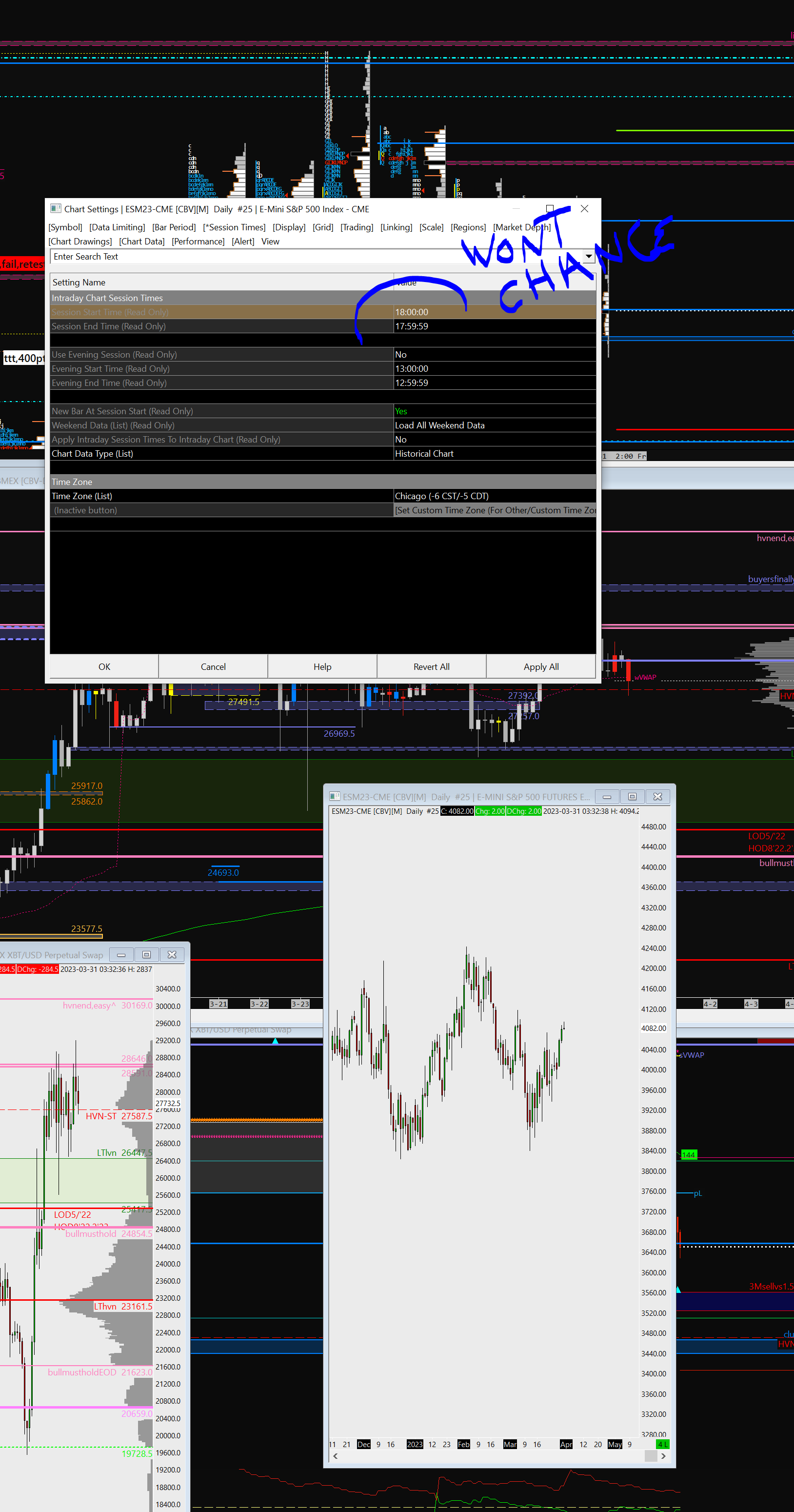 Hi John, I went to a daily chart and went to check time settings, they were off and when I went to change them nothing would highlight when I put the mouse on it. Weird...So I went to a BTC chartbook which has a working daily chart and duped it. I then changed the symbol to ES, cont contract w vol adjust, and then went to change the times from BTC perp stuff to ES. I can't change the time or time zone, nor add/not Globex. It's frozen. What is going on??? See attached for all the current settings thank, Karen ps linking is set to off as well |