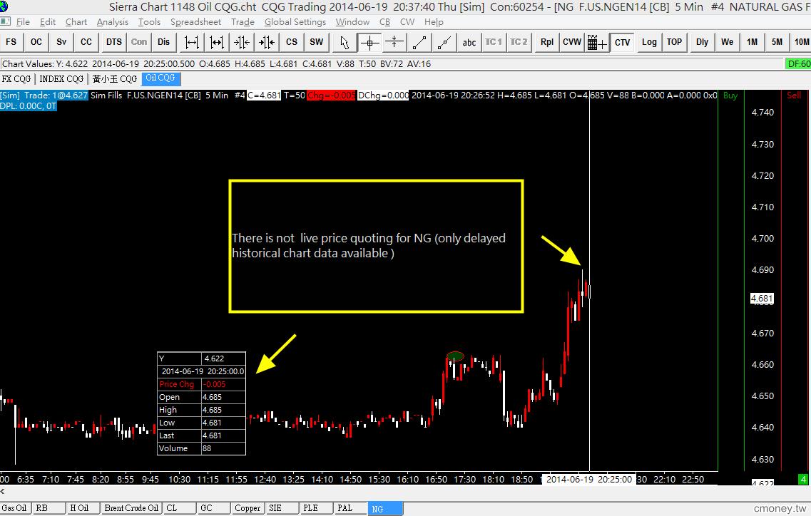 Hi, data feed: CQG symbol: F.US.NGEN14 There is not live price quoting for NG (only delayed historical chart data available ), please refer to the attached. Tkz! ----- Software version: 1148 | 2014-06-19 20:06:23 Enabled for: Advanced Features. | 2014-06-19 20:06:23 Enabled for: Sierra Chart Historical Data Service. | 2014-06-19 20:06:23 Allow Support for Sierra Chart Data Feeds is enabled. | 2014-06-19 20:06:23 Active service: CQG Trading | 2014-06-19 20:06:23 Time Zone: +08:00:00 (HKT+08) | 2014-06-19 20:06:23 2014-06-19 20:06:23 Local computer clock time | 2014-06-19 20:06:23 2014-06-19 12:06:23 GMT time | 2014-06-19 20:06:23 2014-06-19 20:06:23 Time zone adjusted time | 2014-06-19 20:06:23 Time difference to server time: 2 seconds. | 2014-06-19 20:06:23 Program path: C:\SierraChart\ | 2014-06-19 20:06:23 Data Files path: C:\SierraChart\Data\ | 2014-06-19 20:06:23 OS Version Number: 6.2 | 2014-06-19 20:06:23 Checking for new symbol settings for cqg | 2014-06-19 20:06:23 Symbol settings are up-to-date for cqg | 2014-06-19 20:06:23 CQG Trading FIX: Connecting to fixapi.cqgtrader.com. Port: 6912. | 2014-06-19 20:06:28 Resolved address fixapi.cqgtrader.com to IP 208.48.16.214 | 2014-06-19 20:06:28 The network socket is connected. | 2014-06-19 20:06:28 CQG Trading FIX: Sending the Logon message. | 2014-06-19 20:06:28 CQG Trading: Connected to trading server. | 2014-06-19 20:06:29 CQG Trading: Connecting to market data server. | 2014-06-19 20:06:29 Connecting to websocket server. | 2014-06-19 20:06:29 CQG Trading FIX - FCM name: AMP | 2014-06-19 20:06:29 Resolved address api.cqg.com to IP 208.48.16.34 | 2014-06-19 20:06:29 The network socket is connected. | 2014-06-19 20:06:29 Starting SSL connection on the socket. | 2014-06-19 20:06:29 SSL socket is connected. | 2014-06-19 20:06:30 Opening websocket. | 2014-06-19 20:06:30 Sending websocket handshake. | 2014-06-19 20:06:30 Received websocket handshake acknowledgment. | 2014-06-19 20:06:30 TRANSPORT OPEN | 2014-06-19 20:06:30 CQG Trading: Websocket connected. | 2014-06-19 20:06:30 CQG Trading: Sending market data logon message. | 2014-06-19 20:06:30 CQG Trading: Logon successful. | 2014-06-19 20:06:30 CQG Trading: Market data session connected. | 2014-06-19 20:06:30 Date rule based rollover from F.US.DA6H14 to next contract occurs at 2014-03-17 | 2014-06-19 20:06:54 Date rule based rollover from F.US.DA6M14 to next contract occurs at 2014-06-16 | 2014-06-19 20:06:54 Date rule based rollover from F.US.DA6U14 to next contract occurs at 2014-09-15 | 2014-06-19 20:06:54 Checking Intraday data file for symbol F.US.DA6H14 for the date range from 2013-12-16 to 2014-03-17 | 2014-06-19 20:06:54 Checking Daily data file for symbol A6H14 for the date range from 2013-12-16 to 2014-03-17 | 2014-06-19 20:06:54 Checking Intraday data file for symbol F.US.DA6M14 for the date range from 2014-03-17 to 2014-06-16 | 2014-06-19 20:06:54 Checking Daily data file for symbol A6M14 for the date range from 2014-03-17 to 2014-06-16 | 2014-06-19 20:06:54 Checking Intraday data file for symbol F.US.DA6U14 for the date range from 2014-06-16 to 0 | 2014-06-19 20:06:54 Checking Daily data file for symbol A6U14 for the date range from 2014-06-16 to 0 | 2014-06-19 20:06:54 Symbols used for F.US.DA6U14 continuous contract chart: | 2014-06-19 20:06:54 F.US.DA6H14 | 2014-06-19 20:06:54 F.US.DA6M14 | 2014-06-19 20:06:54 F.US.DA6U14 | 2014-06-19 20:06:54 Volume based rollover from F.US.DA6H14 to F.US.DA6M14 occurs at 2014-03-14 | 2014-06-19 20:06:54 Volume based rollover from F.US.DA6M14 to F.US.DA6U14 occurs at 2014-06-13 | 2014-06-19 20:06:54 F.US.DA6U14 [CBV] 5 Min #1: Performing continuous futures contract back adjustment calculations. | 2014-06-19 20:06:54 F.US.DA6U14 [CBV] 5 Min #1: F.US.DA6H14 Open price on 2014-03-14 is 0.9038. | 2014-06-19 20:06:54 F.US.DA6U14 [CBV] 5 Min #1: F.US.DA6M14 Open price on 2014-03-14 is 0.8981. | 2014-06-19 20:06:54 F.US.DA6U14 [CBV] 5 Min #1: F.US.DA6H14 price difference to F.US.DA6M14 is -0.0057000001. | 2014-06-19 20:06:54 F.US.DA6U14 [CBV] 5 Min #1: F.US.DA6M14 Open price on 2014-06-13 is 0.9423. | 2014-06-19 20:06:54 F.US.DA6U14 [CBV] 5 Min #1: F.US.DA6U14 Open price on 2014-06-13 is 0.9362001. | 2014-06-19 20:06:54 F.US.DA6U14 [CBV] 5 Min #1: F.US.DA6M14 price difference to F.US.DA6U14 is -0.0060999002. | 2014-06-19 20:06:54 F.US.DA6U14 [CBV] 5 Min #1: Back adjust amount for symbol F.US.DA6H14 is -0.0117999. | 2014-06-19 20:06:54 F.US.DA6U14 [CBV] 5 Min #1: Back adjust amount for symbol F.US.DA6M14 is -0.0060999002. | 2014-06-19 20:06:54 Date rule based rollover from F.US.BP6H14 to next contract occurs at 2014-03-17 | 2014-06-19 20:06:54 Date rule based rollover from F.US.BP6M14 to next contract occurs at 2014-06-16 | 2014-06-19 20:06:54 Date rule based rollover from F.US.BP6U14 to next contract occurs at 2014-09-15 | 2014-06-19 20:06:54 Checking Intraday data file for symbol F.US.BP6H14 for the date range from 2013-12-16 to 2014-03-17 | 2014-06-19 20:06:55 Checking Daily data file for symbol B6H14 for the date range from 2013-12-16 to 2014-03-17 | 2014-06-19 20:06:55 Checking Intraday data file for symbol F.US.BP6M14 for the date range from 2014-03-17 to 2014-06-16 | 2014-06-19 20:06:55 Checking Daily data file for symbol B6M14 for the date range from 2014-03-17 to 2014-06-16 | 2014-06-19 20:06:55 Checking Intraday data file for symbol F.US.BP6U14 for the date range from 2014-06-16 to 0 | 2014-06-19 20:06:55 Checking Daily data file for symbol B6U14 for the date range from 2014-06-16 to 0 | 2014-06-19 20:06:55 Symbols used for F.US.BP6U14 continuous contract chart: | 2014-06-19 20:06:55 F.US.BP6H14 | 2014-06-19 20:06:55 F.US.BP6M14 | 2014-06-19 20:06:55 F.US.BP6U14 | 2014-06-19 20:06:55 Volume based rollover from F.US.BP6H14 to F.US.BP6M14 occurs at 2014-03-14 | 2014-06-19 20:06:55 Volume based rollover from F.US.BP6M14 to F.US.BP6U14 occurs at 2014-06-13 | 2014-06-19 20:06:55 F.US.BP6U14 [CBV] 5 Min #2: Performing continuous futures c