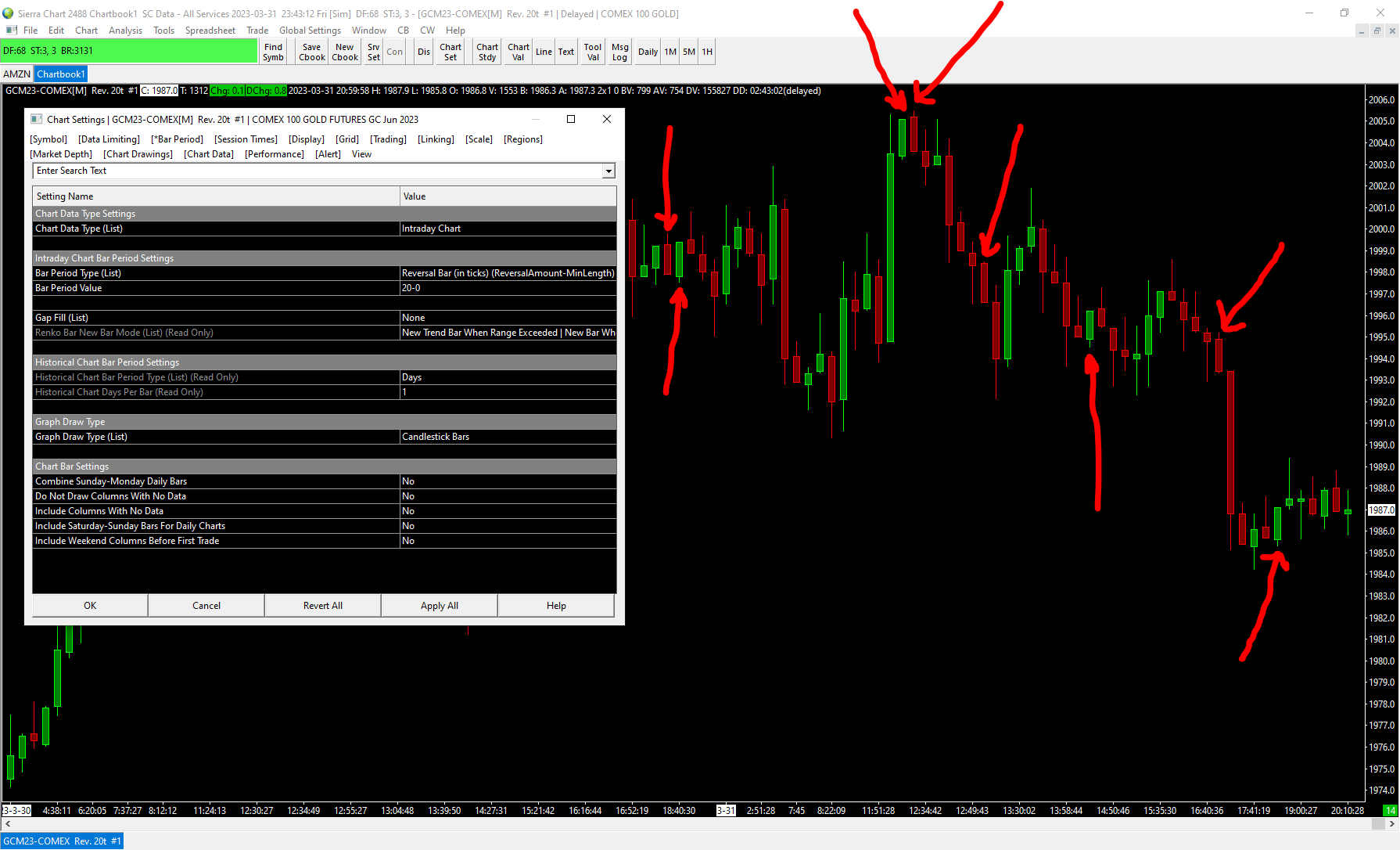 Hi, thanks for looking into this. I followed all the steps, still seeing the same results. Attaching a screenshot with setting and log window details as well. Could you please send a screenshot of how GCM23 should look like for 31st of March with Reversal bar 20-0? thanks M |