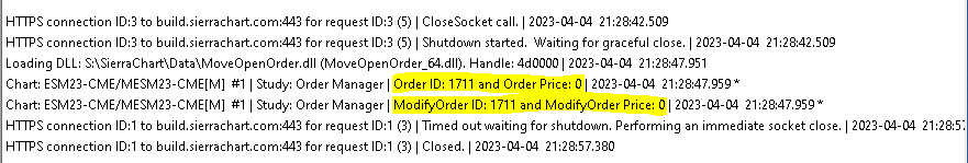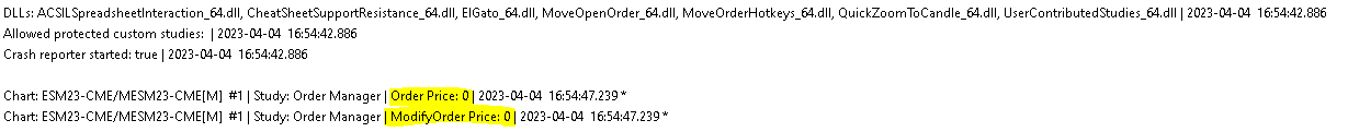 Oh .. good point. I've modified the code to print the Log, and I'm getting Price = 0 So, the question is now why the price of the order that I've identified and want to change, has the price 0 ? Log attached. Thanks for your support ! if( shiftPressed && sPressed ){ SCString Message; while(sc.GetOrderByIndex(i, order) != SCTRADING_ORDER_ERROR) { i++; if (order.OrderStatusCode == SCT_OSC_OPEN && order.OrderTypeAsInt == SCT_ORDERTYPE_STOP_LIMIT) { s_SCNewOrder ModifyOrder; Message.Format("Order Price: %i",order.Price1); sc.AddMessageToLog(Message, 1); ModifyOrder.InternalOrderID = order.InternalOrderID; ModifyOrder.OrderType = SCT_OSC_OPEN; float price = 4160.25; ModifyOrder.Price1 = price; Message.Format("ModifyOrder Price: %i",ModifyOrder.Price1); sc.AddMessageToLog(Message, 1); sc.ModifyOrder(ModifyOrder); break; } } } |