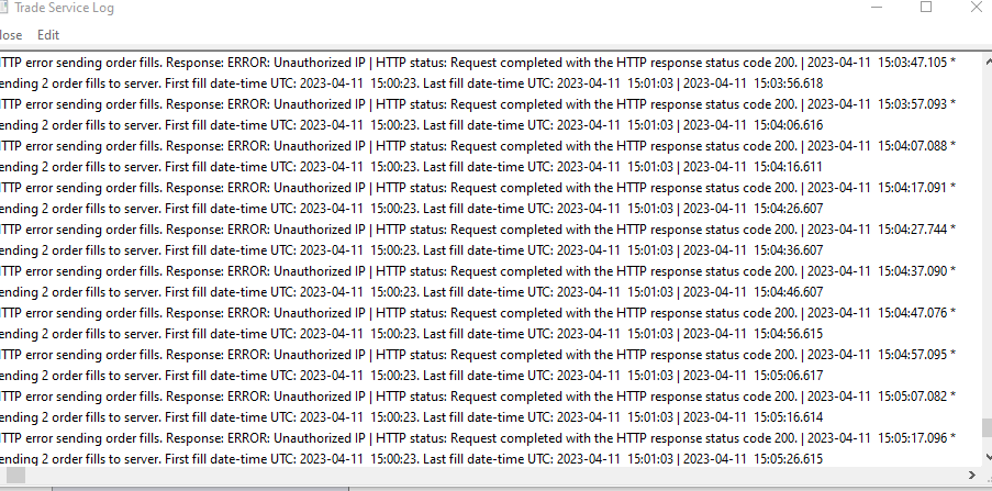 This is what keeps popping up. TradeActivity files query time: 0.059440 seconds. Entries: 0. Current queries: 2 | 2023-04-08 12:34:42.146 TradeActivity files query time: 0.000674 seconds. Entries: 0. Current queries: 1 | 2023-04-08 12:34:42.147 TradeActivity files query time: 0.025783 seconds. Entries: 42. Current queries: 1 | 2023-04-08 12:35:04.476 TradeActivity files query time: 0.000535 seconds. Entries: 0. Current queries: 2 | 2023-04-08 12:35:04.505 TradeActivity files query time: 0.027252 seconds. Entries: 42. Current queries: 1 | 2023-04-08 12:35:05.992 TradeActivity files query time: 0.004873 seconds. Entries: 42. Current queries: 1 | 2023-04-08 12:35:08.922 TradeActivity files query time: 0.004853 seconds. Entries: 42. Current queries: 1 | 2023-04-08 12:35:10.359 TradeActivity files query time: 0.005224 seconds. Entries: 42. Current queries: 1 | 2023-04-08 12:35:12.660 TradeActivity files query time: 0.004214 seconds. Entries: 42. Current queries: 1 | 2023-04-08 12:35:15.467 TradeActivity files query time: 0.120393 seconds. Entries: 42. Current queries: 1 | 2023-04-09 12:35:05.565 GAIN Capital/OEC | ALERT: Your password expired. We encourage you to change it. | 2023-04-10 02:03:26.095 SC Data - All Services | MaxConnectionsDifferentDevices = 1, NumCurrentConnectionsDifferentDevices = 1 | 2023-04-10 02:03:27.162 SC Data - All Services | MaxConnectionsForSameDevice = 3, NumCurrentConnectionsForSameDevice = 1 | 2023-04-10 02:03:27.162 TradeActivity files query time: 0.128991 seconds. Entries: 42. Current queries: 1 | 2023-04-10 02:03:29.351 GAIN Capital/OEC | ALERT: Your password expired. We encourage you to change it. | 2023-04-10 17:36:01.495 SC Data - All Services | MaxConnectionsDifferentDevices = 1, NumCurrentConnectionsDifferentDevices = 1 | 2023-04-10 17:36:05.356 SC Data - All Services | MaxConnectionsForSameDevice = 3, NumCurrentConnectionsForSameDevice = 1 | 2023-04-10 17:36:05.356 TradeActivity files query time: 0.119382 seconds. Entries: 42. Current queries: 1 | 2023-04-10 22:00:32.972 GAIN Capital/OEC | ALERT: Your password expired. We encourage you to change it. | 2023-04-11 07:31:07.258 SC Data - All Services | MaxConnectionsDifferentDevices = 1, NumCurrentConnectionsDifferentDevices = 1 | 2023-04-11 07:31:14.167 SC Data - All Services | MaxConnectionsForSameDevice = 3, NumCurrentConnectionsForSameDevice = 1 | 2023-04-11 07:31:14.167 SC Data - All Services | MaxConnectionsDifferentDevices = 1, NumCurrentConnectionsDifferentDevices = 1 | 2023-04-11 07:37:29.117 SC Data - All Services | MaxConnectionsForSameDevice = 3, NumCurrentConnectionsForSameDevice = 2 | 2023-04-11 07:37:29.117 GAIN Capital/OEC | ALERT: Your password expired. We encourage you to change it. | 2023-04-11 07:37:58.980 SC Data - All Services | MaxConnectionsDifferentDevices = 1, NumCurrentConnectionsDifferentDevices = 1 | 2023-04-11 07:37:59.857 SC Data - All Services | MaxConnectionsForSameDevice = 3, NumCurrentConnectionsForSameDevice = 1 | 2023-04-11 07:37:59.857 Sending 1 order fills to server. First fill date-time UTC: 2023-04-11 15:00:23. Last fill date-time UTC: 2023-04-11 15:00:23 | 2023-04-11 15:00:26.559 HTTP error sending order fills. Response: ERROR: Unauthorized IP | HTTP status: Request completed with the HTTP response status code 200. | 2023-04-11 15:00:27.037 * Sending 1 order fills to server. First fill date-time UTC: 2023-04-11 15:00:23. Last fill date-time UTC: 2023-04-11 15:00:23 | 2023-04-11 15:00:36.544 HTTP error sending order fills. Response: ERROR: Unauthorized IP | HTTP status: Request completed with the HTTP response status code 200. | 2023-04-11 15:00:37.016 * Sending 1 order fills to server. First fill date-time UTC: 2023-04-11 15:00:23. Last fill date-time UTC: 2023-04-11 15:00:23 | 2023-04-11 15:00:46.548 HTTP error sending order fills. Response: ERROR: Unauthorized IP | HTTP status: Request completed with the HTTP response status code 200. | 2023-04-11 15:00:47.044 * Sending 1 order fills to server. First fill date-time UTC: 2023-04-11 15:00:23. Last fill date-time UTC: 2023-04-11 15:00:23 | 2023-04-11 15:00:56.547 HTTP error sending order fills. Response: ERROR: Unauthorized IP | HTTP status: Request completed with the HTTP response status code 200. | 2023-04-11 15:00:57.023 * Sending 2 order fills to server. First fill date-time UTC: 2023-04-11 15:00:23. Last fill date-time UTC: 2023-04-11 15:01:03 | 2023-04-11 15:01:06.556 HTTP error sending order fills. Response: ERROR: Unauthorized IP | HTTP status: Request completed with the HTTP response status code 200. | 2023-04-11 15:01:07.042 * Sending 2 order fills to server. First fill date-time UTC: 2023-04-11 15:00:23. Last fill date-time UTC: 2023-04-11 15:01:03 | 2023-04-11 15:01:16.546 HTTP error sending order fills. Response: ERROR: Unauthorized IP | HTTP status: Request completed with the HTTP response status code 200. | 2023-04-11 15:01:17.661 * Sending 2 order fills to server. First fill date-time UTC: 2023-04-11 15:00:23. Last fill date-time UTC: 2023-04-11 15:01:03 | 2023-04-11 15:01:26.545 HTTP error sending order fills. Response: ERROR: Unauthorized IP | HTTP status: Request completed with the HTTP response status code 200. | 2023-04-11 15:01:27.024 * Sending 2 order fills to server. First fill date-time UTC: 2023-04-11 15:00:23. Last fill date-time UTC: 2023-04-11 15:01:03 | 2023-04-11 15:01:36.546 HTTP error sending order fills. Response: ERROR: Unauthorized IP | HTTP status: Request completed with the HTTP response status code 200. | 2023-04-11 15:01:37.024 * Sending 2 order fills to server. First fill date-time UTC: 2023-04-11 15:00:23. Last fill date-time UTC: 2023-04-11 15:01:03 | 2023-04-11 15:01:46.546 HTTP error sending order fills. Response: ERROR: Unauthorized IP | HTTP status: Request completed with the HTTP response status code 200. | 2023-04-11 15:01:47.017 * Sending 2 order fills to server. First fill date-time UTC: 2023-04-11 15:00:23. Last fill date-time UTC: 2023-04-11 15:01:03 | 2023-04-11 1