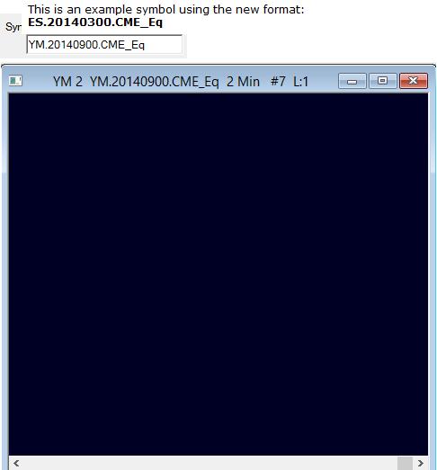 This is not a valid symbol: YM.20140900.CME_Eq Do not manually type or edit CTS symbols. Only use File >> Find Symbol. Or the Find button in Chart >> Chart Settings. The easiest thing to do is to open a new chart. Sierra Chart Support - Engineering Level Your definitive source for support. Other responses are from users. Try to keep your questions brief and to the point. Be aware of support policy: https://www.sierrachart.com/index.php?l=PostingInformation.php#GeneralInformation For the most reliable, advanced, and zero cost futures order routing, *change* to the Teton service: Sierra Chart Teton Futures Order Routing Date Time Of Last Edit: 2014-06-20 04:02:03