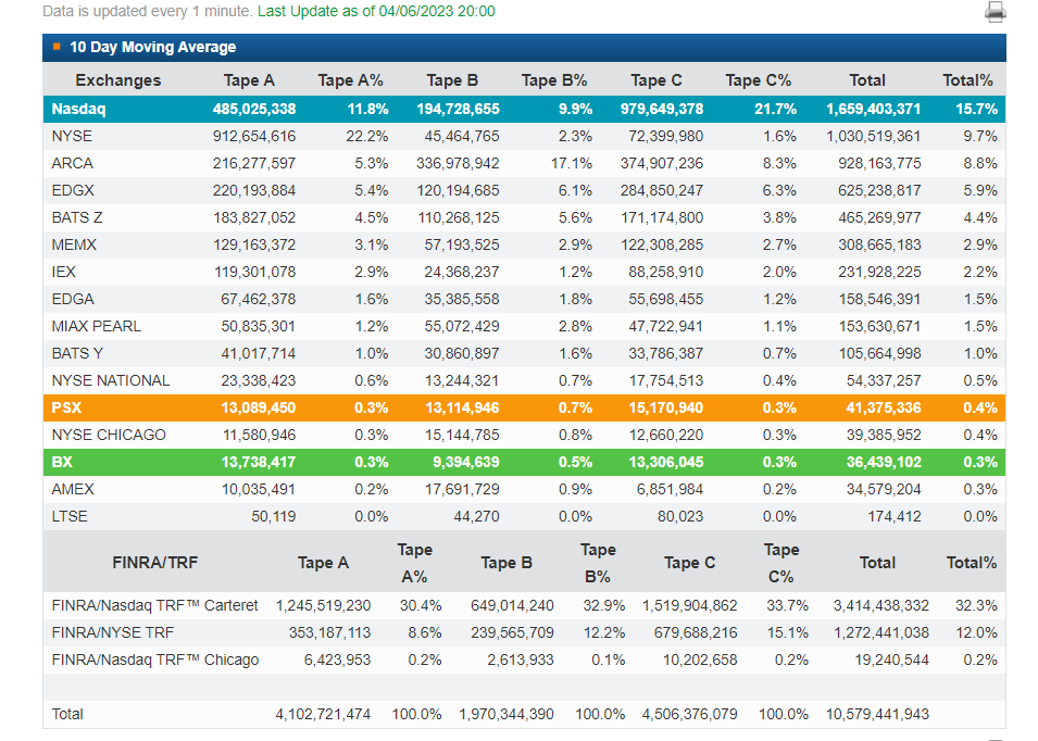 I'm a new customer and I'm currently trying out your charting tool. I'm a day trader who focuses on stocks and ETFs, and I use MBOX tool to get an insight on the supply and demand (They have their own proprietary calculations but in essence it uses ask volume,bid volume, Uptick and downtick, Delta). I've noticed some concerns from other users about the incomplete intraday volume data for us equities and the upcoming implementation of consolidated volume. I'm wondering if you could help me understand this better? I know other tools, like TradingView, claims that they offer all the traded volume for 9$/month. However, I'm really enjoying your awesome charting tool, and just like everyone else, I would rather combine ur tool with such data instead. Can you tell me what the difference is between the data that TradingView provides (Nasdaq, NYSE, ARCA) and the data that we'll have through your Nasdaq TotalView and the consolidated volume? link to their data options (https://www.tradingview.com/gopro/#markets) Here is picture of the trading volume breakdown from Nasdaq, could you please clarify How much percentage you will be covering? Thanks so much for your help! Date Time Of Last Edit: 2023-04-10 08:23:34