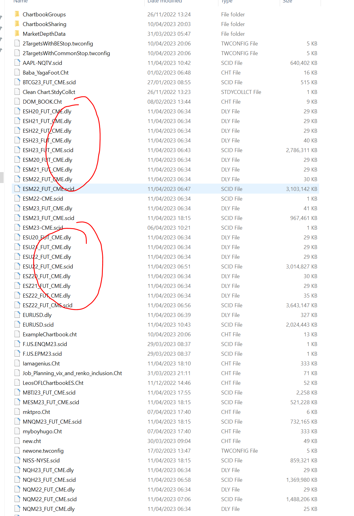 Stop deleting your SCID files! The dudes at OFL and your "repair guy" don't know what the fuck they are talking about. These files sitting there aren't going to be a problem unless you start running out of storage space. Further the size won't be the size on disk actually used unless you have disabled file compression. I have 123gb of SCID files that take up a total of 34gb of disk space as an example. You can delete them for unused contracts sure, but caveat on that: If you have some longer term charts that have Continuous Contract with either of the 'Back Adjusted' settings enabled you need to keep the relevant SCID files as well, or they will just get downloaded again. e.g: an ES hourly chart with a years worth of data, and Continuous Contract set to 'Date Rule Rollover - Back Adjusted' you are going to need to have all the SCID files from ESH22_FUT_CME.SCID through to ESM23_FUT_CME.SCID, otherwise Sierra will re-download the data. Hope that explains why you shouldn't delete them. |