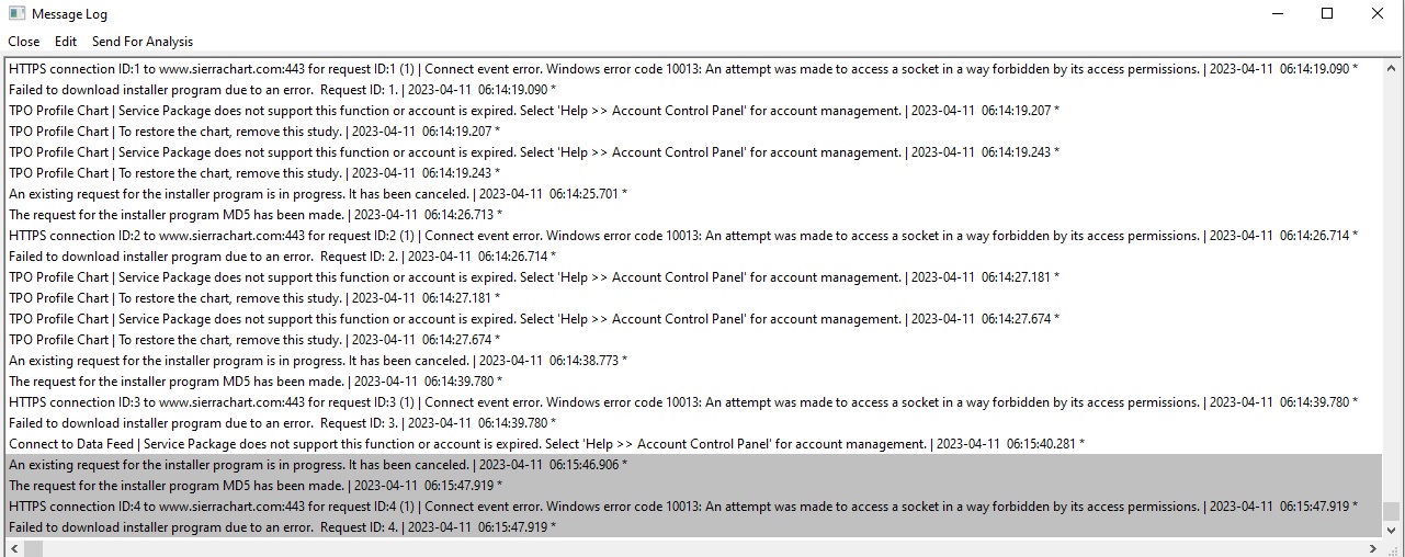Looks like a network firewall in your system is blocking the connection. Try updating using the installer from here: https://download2.sierrachart.com/downloads/SierraChartFileDownloader.exe Sierra Chart Support - Engineering Level Your definitive source for support. Other responses are from users. Try to keep your questions brief and to the point. Be aware of support policy: https://www.sierrachart.com/index.php?l=PostingInformation.php#GeneralInformation For the most reliable, advanced, and zero cost futures order routing, use the Teton service: Sierra Chart Teton Futures Order Routing Date Time Of Last Edit: 2023-04-11 11:32:35