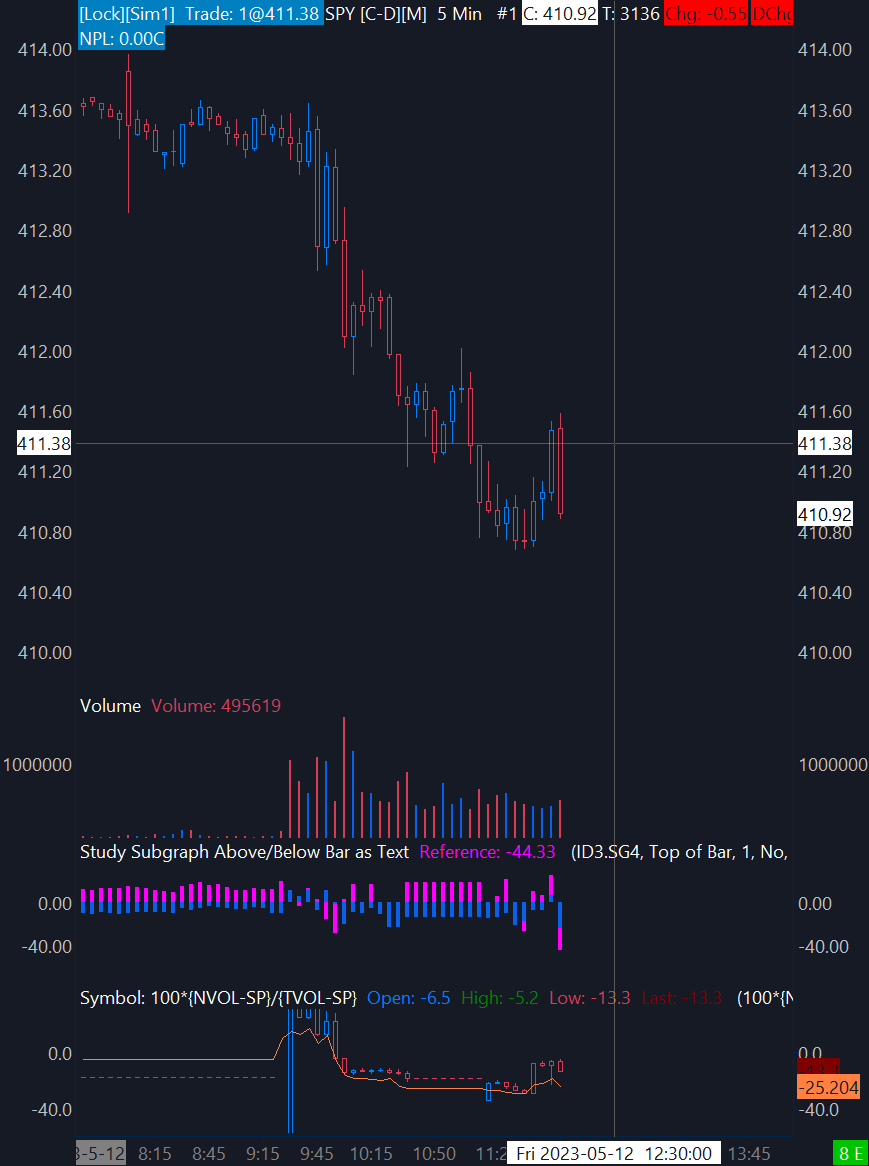 Both my tick and volume internal calculations are not making any sense after the SC update to Revision 45597 yesterday. I was forced to update after some incompatibility issue with the service I was using (Rythmic). For instance, both the percent tick calculation (100*{TICK-NYSE_NASDAQ_NYSEMKT}/({DTIS-NYSE_NASDAQ_NYSEMKT}+{UTIS-NYSE_NASDAQ_NYSEMKT}) on the bottom panel and the internal volume calculation (100*{NVOL-SP}/{TVOL-SP}) on the second to bottom panel have constant values from 10:00 to 10:30 on 4/11 (see https://www.sierrachart.com/image.php?Image=1681228508588.png). I have a redundant tick calculation in TV that does not show the constant values, and the tick values should not be constant across 7 subsequent 5 minute intervals. I did not have this issue before the update, and have seen this issue both yesterday and today.