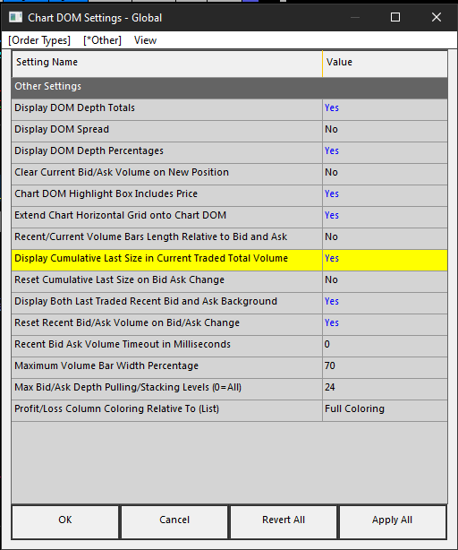 Refer to the following: Global Trade Settings Windows: Display Cumulative Last Size in Current Traded Total Volume (Global Settings >> Chart DOM Settings >> Other >> Other Settings) I would like to reduce the width of the ladder so I can have more ladders on one screen and my eye does not have to keep bouncing from column to column. This would be helpful.