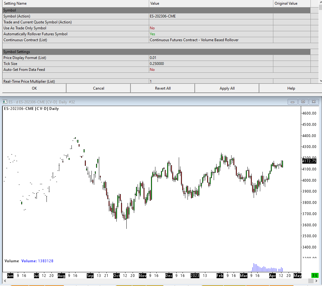 Not sure what happened, but all of a sudden, my continuous contracts don't load. I only get the current contract and none of the previous ones even though I have it set to load them with the volume rollover rule. Please see the attached image where I show the ES daily chart along with the chart settings box opened to show my settings.