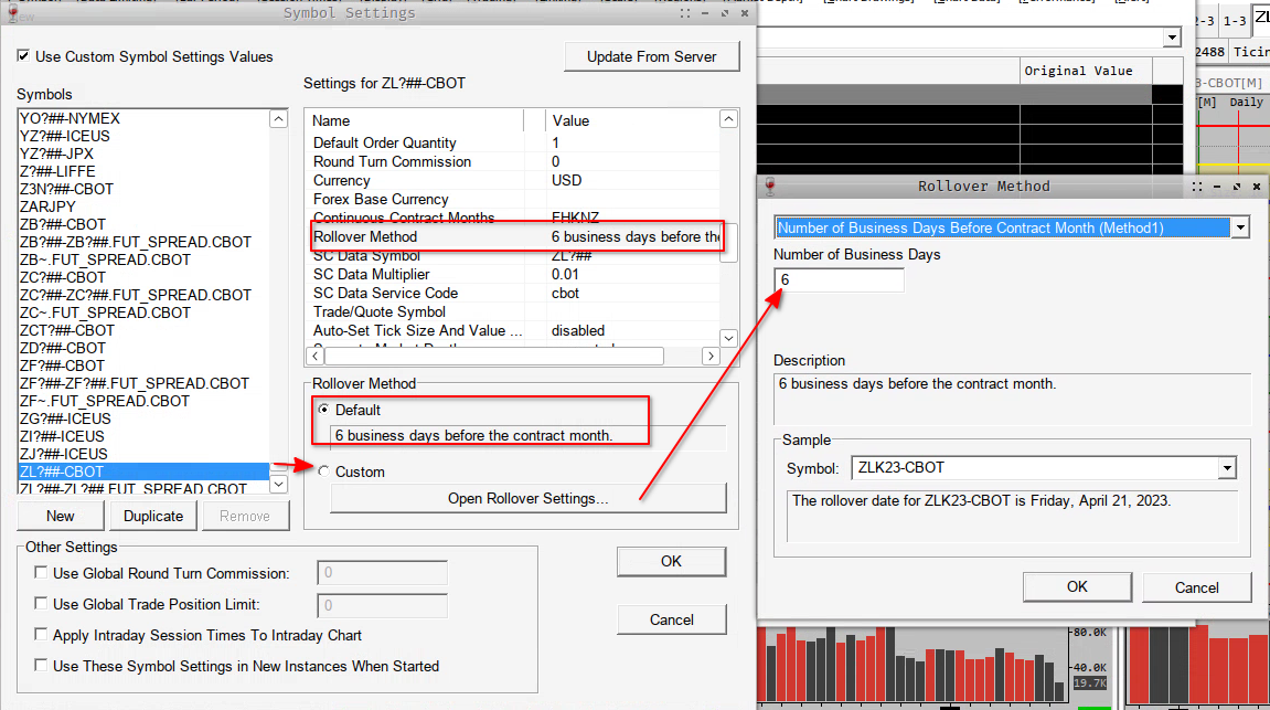 I see the issue now. The ZL symbol's definition (Chart >> Chart Settings >> Edit Global Symbol Settings) in SC refers to a wrong rollover method. By default, it uses 6 business days before the contract month in SC, although it should be the same as for the ZM: 3 business days before the contract month (28 April 2023). I suppose, because of this (wrong rollover setting), the Volume based continuous contract triggers a rollover warning. If I am correct, you can manually change this setting in the symbol settings for the ZL, to 3 days. Date Time Of Last Edit: 2023-04-19 16:40:04