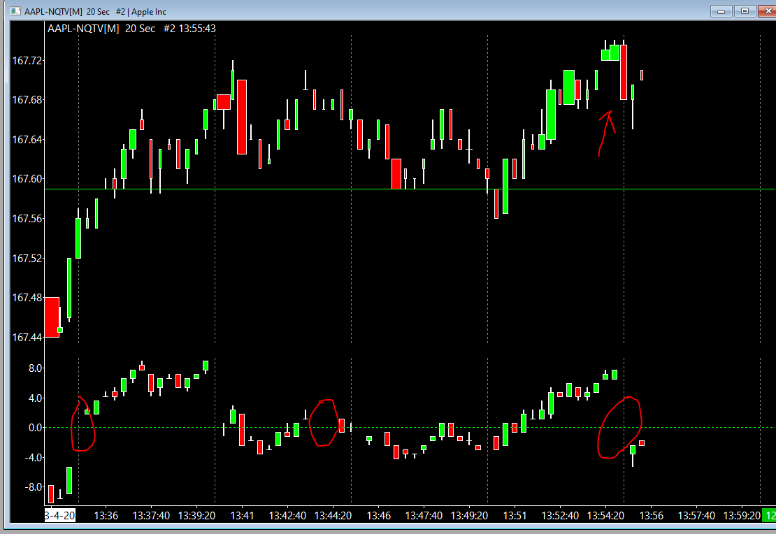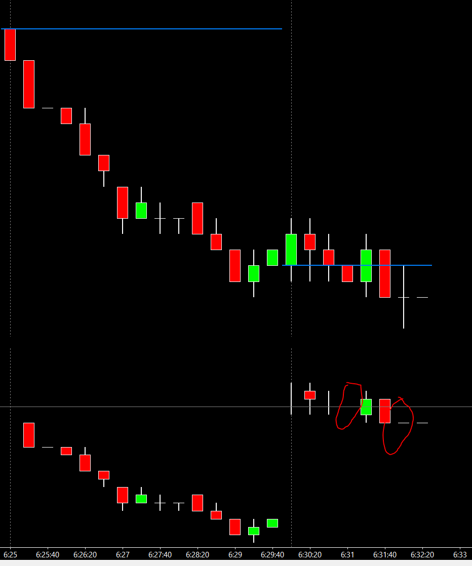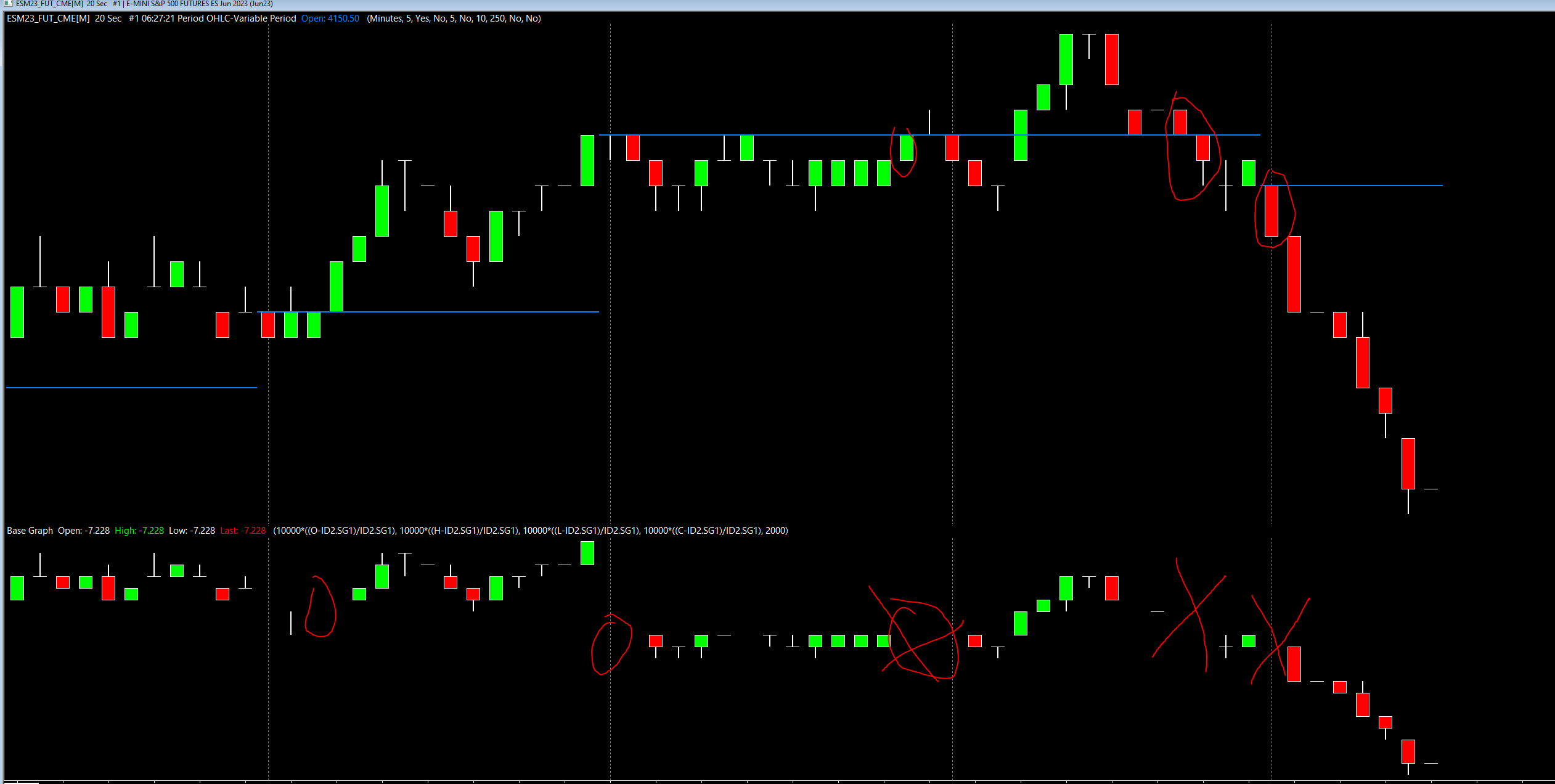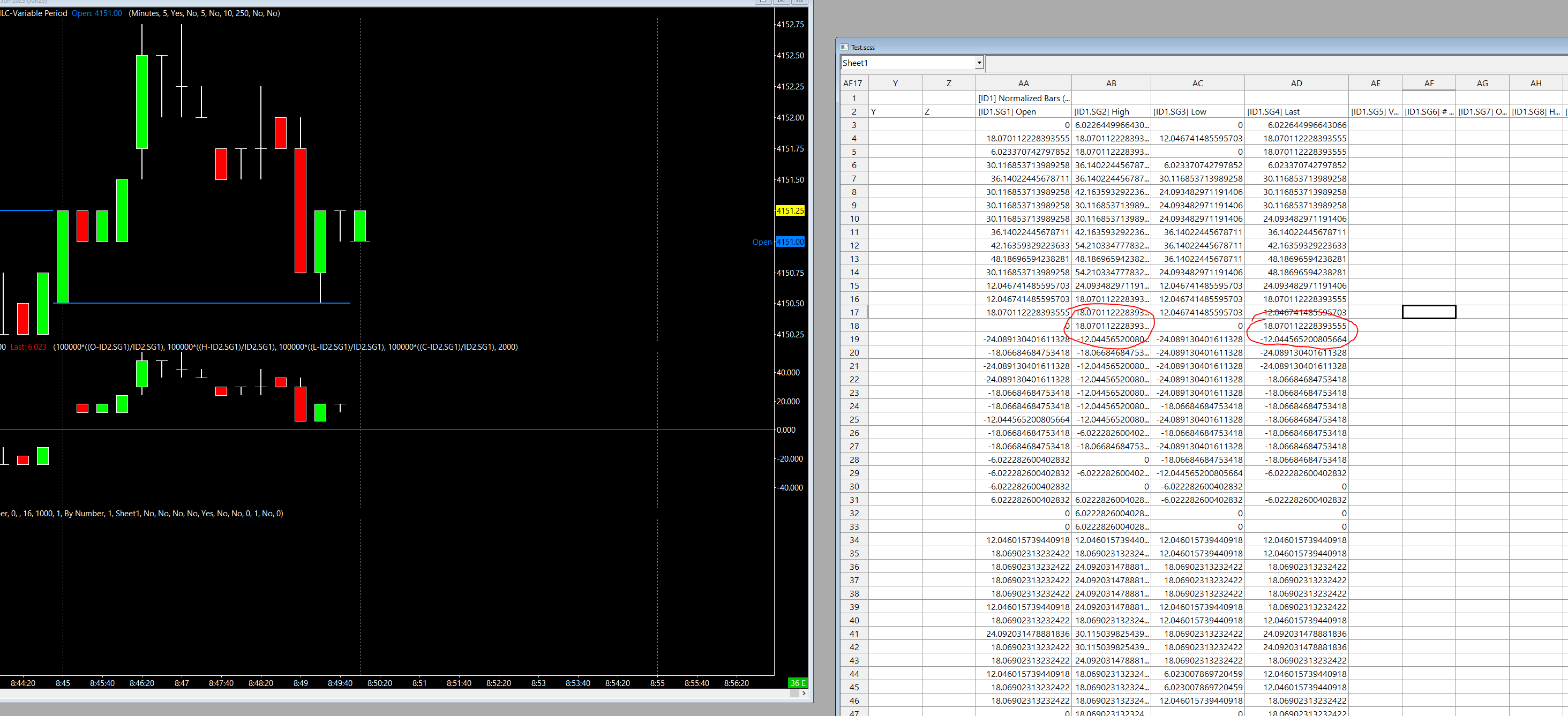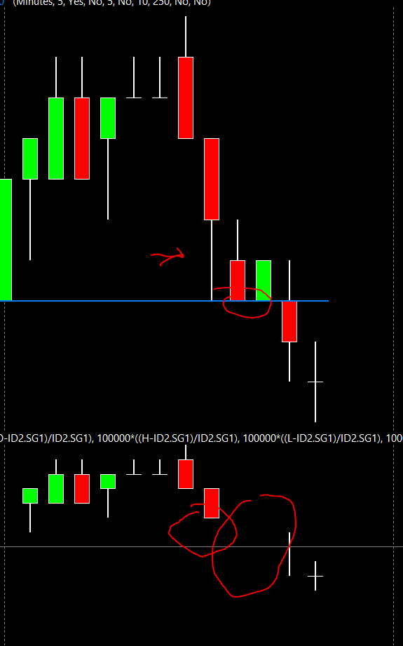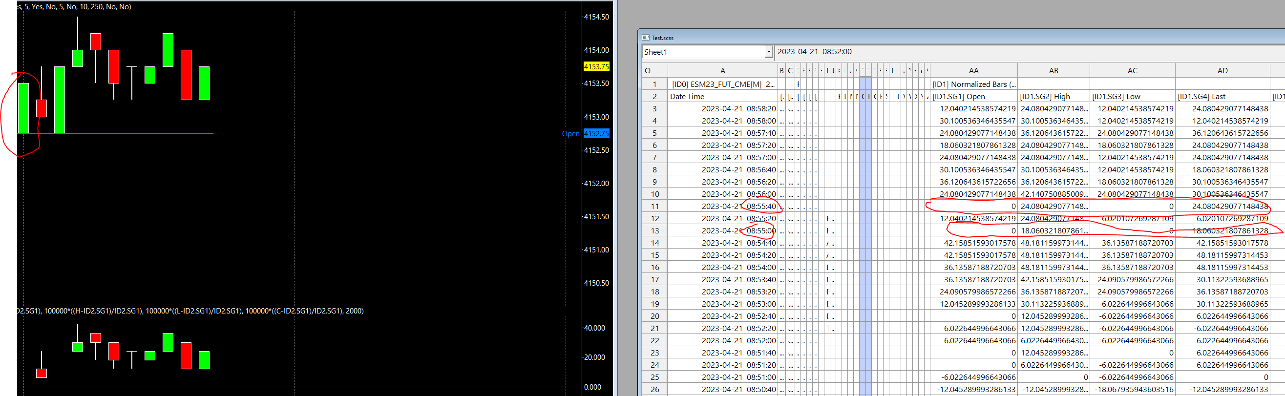 Hi, Thank you for the response however I'm very confused! The top chart is plotting movement and volume, I doubt there is a second that Apple doesn't trade at all and certainly not for 20 seconds. The top candle is printing like normal and I've verified its accuracy with another data feed/trading platform. But taking that data and using spreadsheet bars below there are some bars not showing up. I can't see how this isn't a bug or some setting I don't have checked. All I'm doing is normalizing the bars so ANY movement on top WILL cause movement below. It's not just wrong NOTHING shows up on some bars even for BIG moves on stock candle above. Can you please run this chart and see for yourself, something is wrong and the code is as simple as it can get. High of bar is 10000*((H-5m OP)/5mOP) I didn't want fractions below so kept adding a 0 till I got whole numbers for scale. Here's pic of the S&P futures and notice when I add this study on PAST data there are many bars NOT showing on the bottom. I really like this study concept and see it having real benefit to my trading but can't use it till it works perfectly and its missing many bars. Please help me figure out what I did wrong or if its a bug try to fix it. |