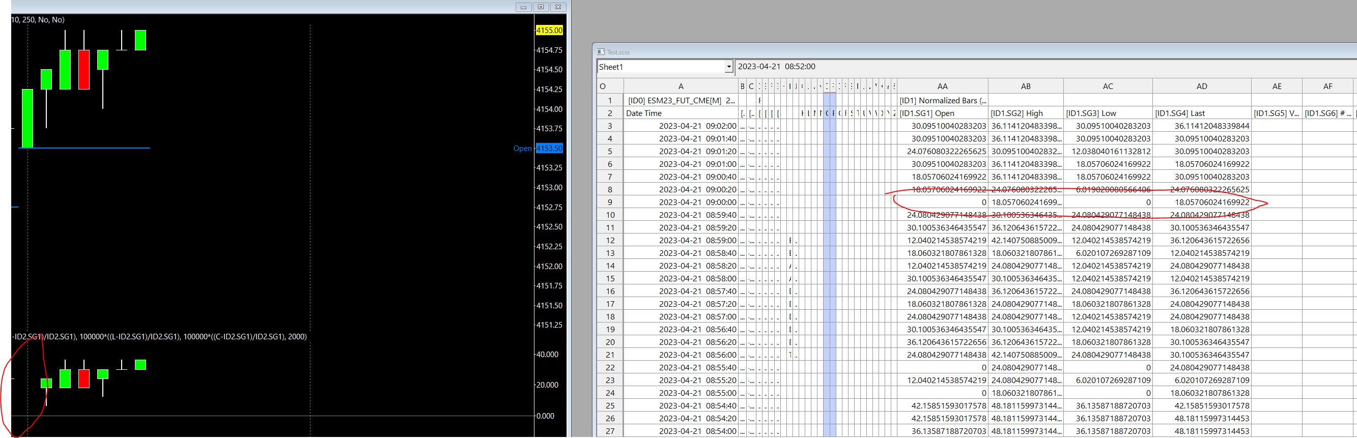 Hi, I did put spreadsheet study on and it on bar that's wrong has open 0, high 18.07, low 0, last 18.07 so it should have drawn a candle up with open and low at 0 and high and close at 18.07 but it didn't. Attaching pics. |