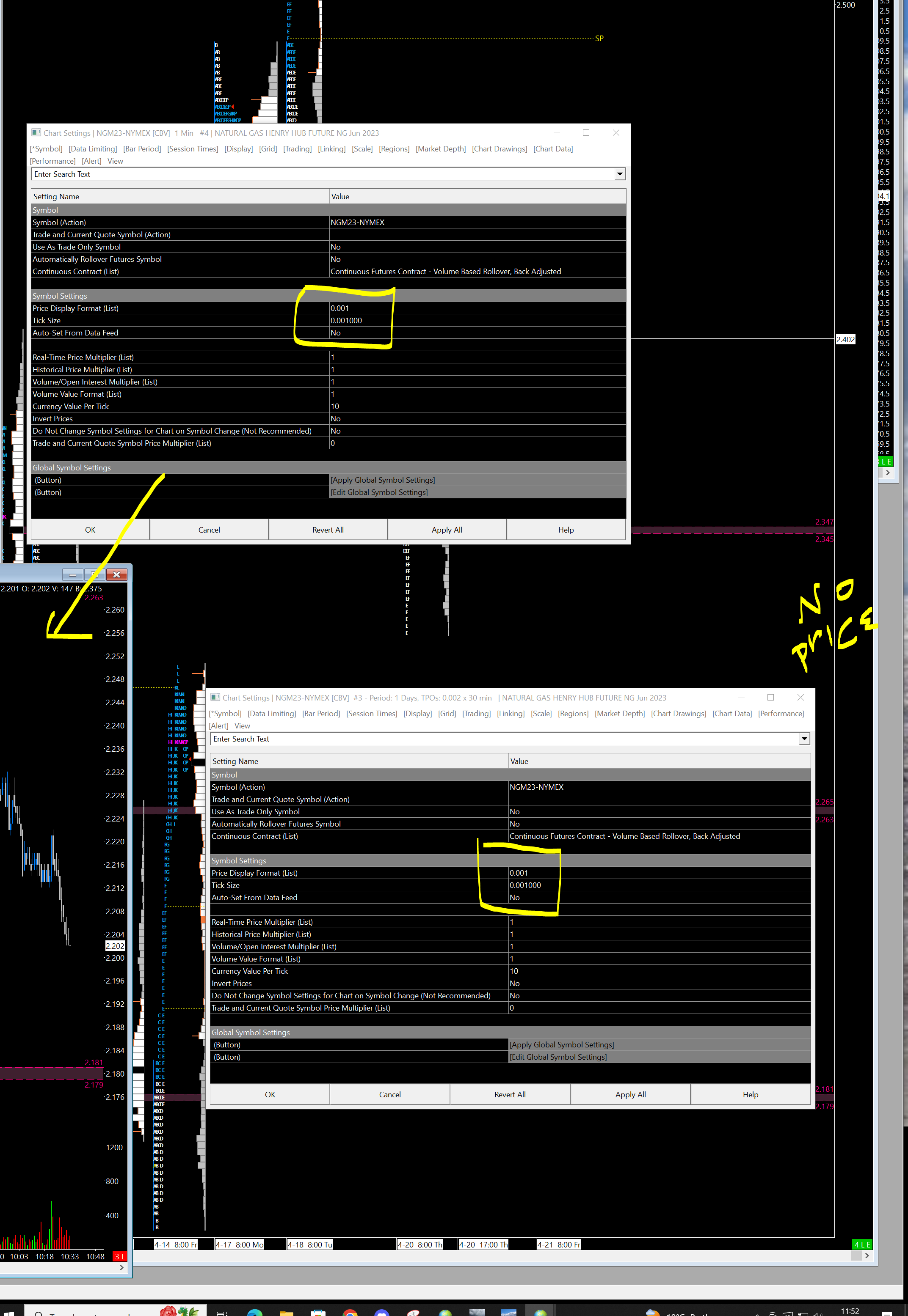 John, This is natty gas. I can't get the scale to work on the right side for the market profile chart. You see I have the exact same tick settings on both charts. The 1 min chart is fine, but nothing I do to MP will make it scale right. I have tried every single option when I right click in the grid area. Nothing they all look like this-wide huge gap with no value. Help please, thank you |