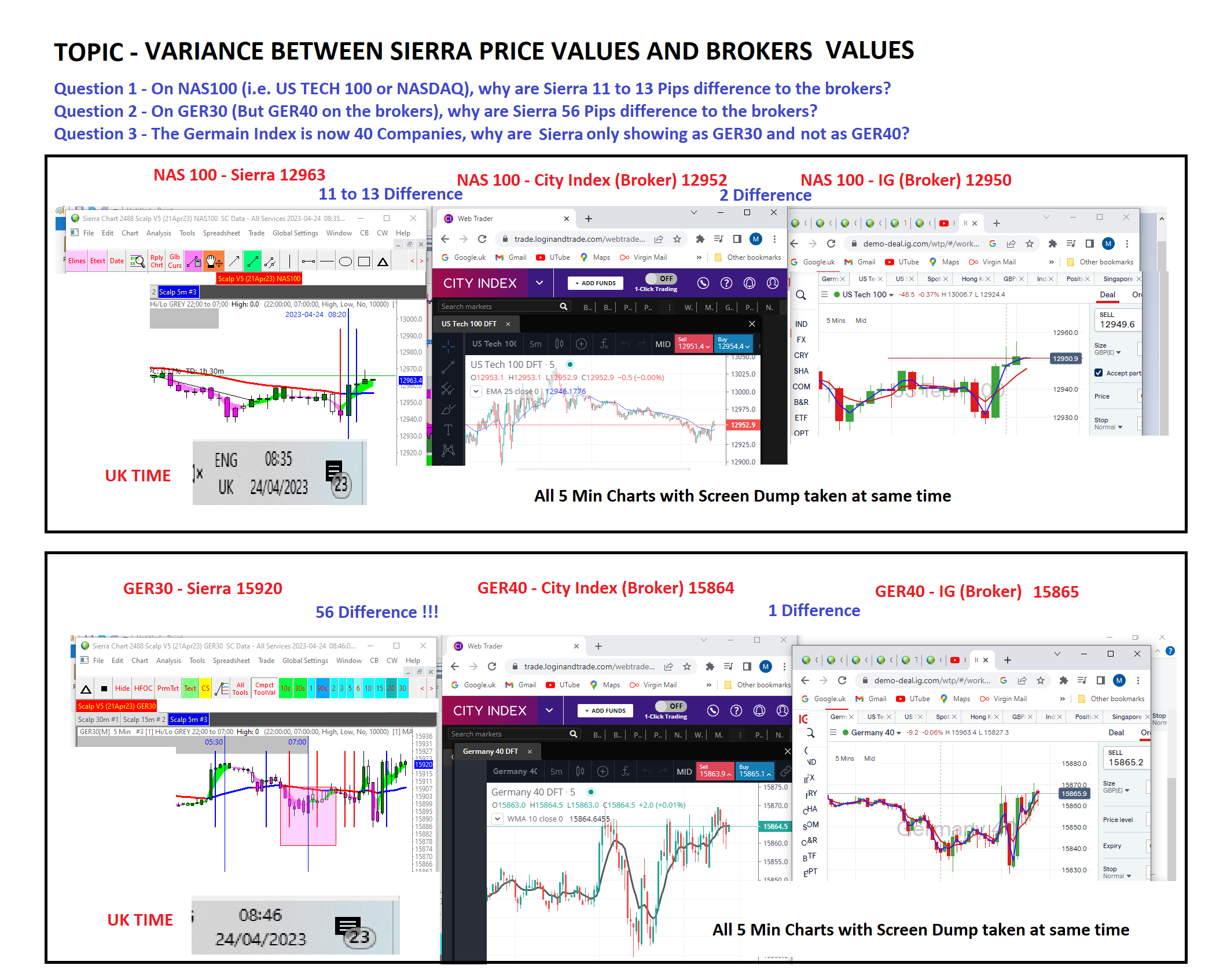 Hello Sierra REF - PROBLEMS WITH PRICE DIFFERENCE BETWEEN BROKERS AND SIERRA I only trade a few symbols, mainly the indices (GER40, NASDAQ, WALL STREET etc). The issue I am facing is the discrepancy in prices between what is reported on Sierra and what is reported at the brokers. I am 11 Pips adrift on NASDAQ but 56 pips difference on GER30. This makes fast trading (scalping) very difficult for me. So, my questions are: - 1. On Sierra ‘NAS100’ (i.e., Brokers US Tech 100) why is the price 11 to 13 pips difference? 2. On Sierra ‘GER30’ (i.e., Brokers GER40) why is the price 56 pips difference? 3. The Brokers offer GER40, Sierras list GER30. Are they the same? If they are the same instruments, then why are they different labels? Or should I be using a different Sierra Symbol? 4. Overall, are the price differences because I am only on Package 3? If so, what package would give me the ‘real’ live data? 5. Or am I using the incorrect symbols on Sierra to trade US TECH 100 and GER 40 on the brokers? I have added a screen shot so you can see the differences in prices Thanks Mark B |