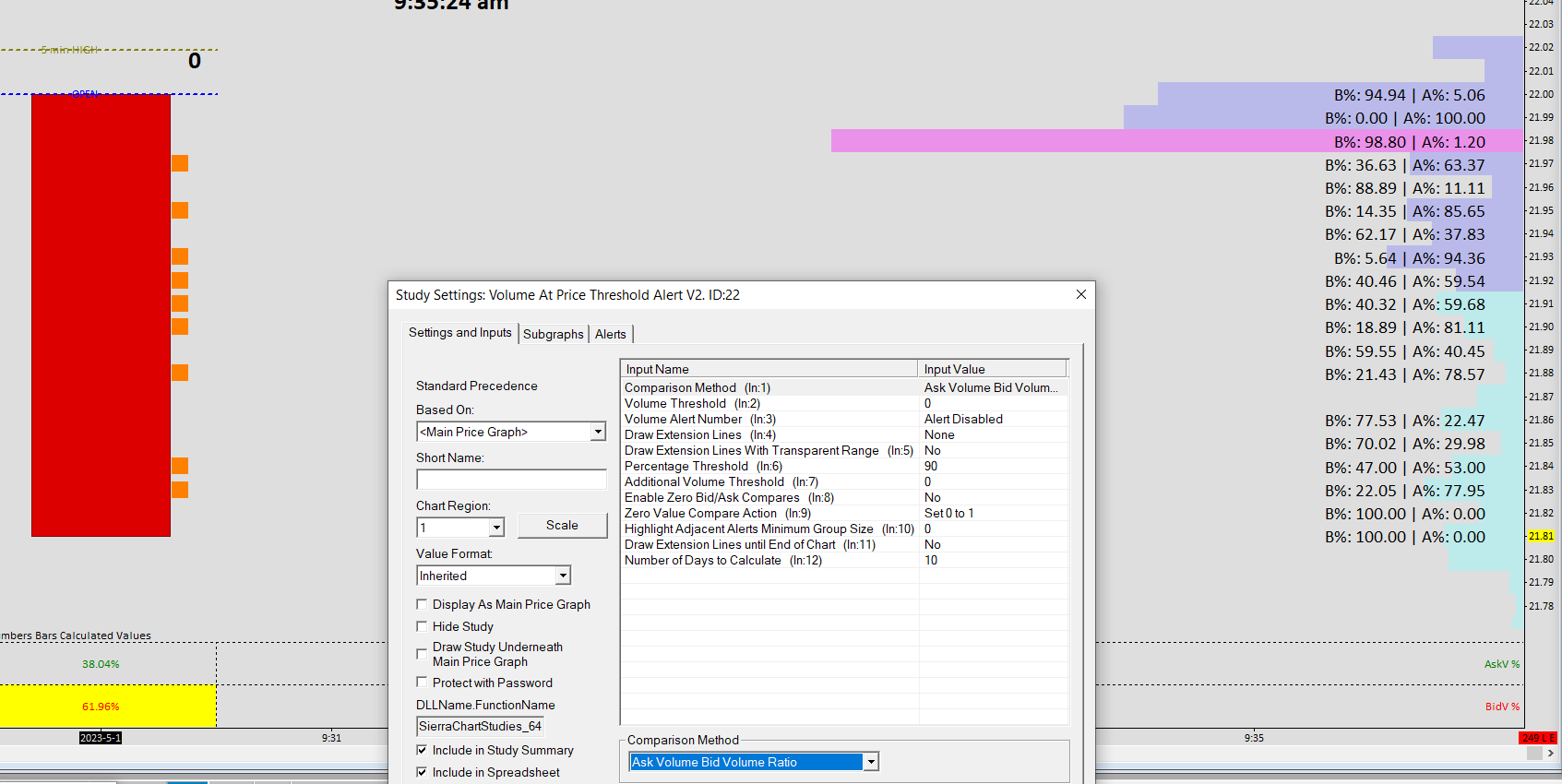 Use the Volume at Price Threshold Alert study: Volume at Price Threshold Alert V2 And refer to this information about the Percentage Threshold Input: Percentage Threshold: This sets the percentage threshold when the Comparison Method Input is set to Ask Volume Bid Volume Ratio or Ask Volume Bid Volume Diagonal Ratio. 1 equals 1%. 100 equals 100%.