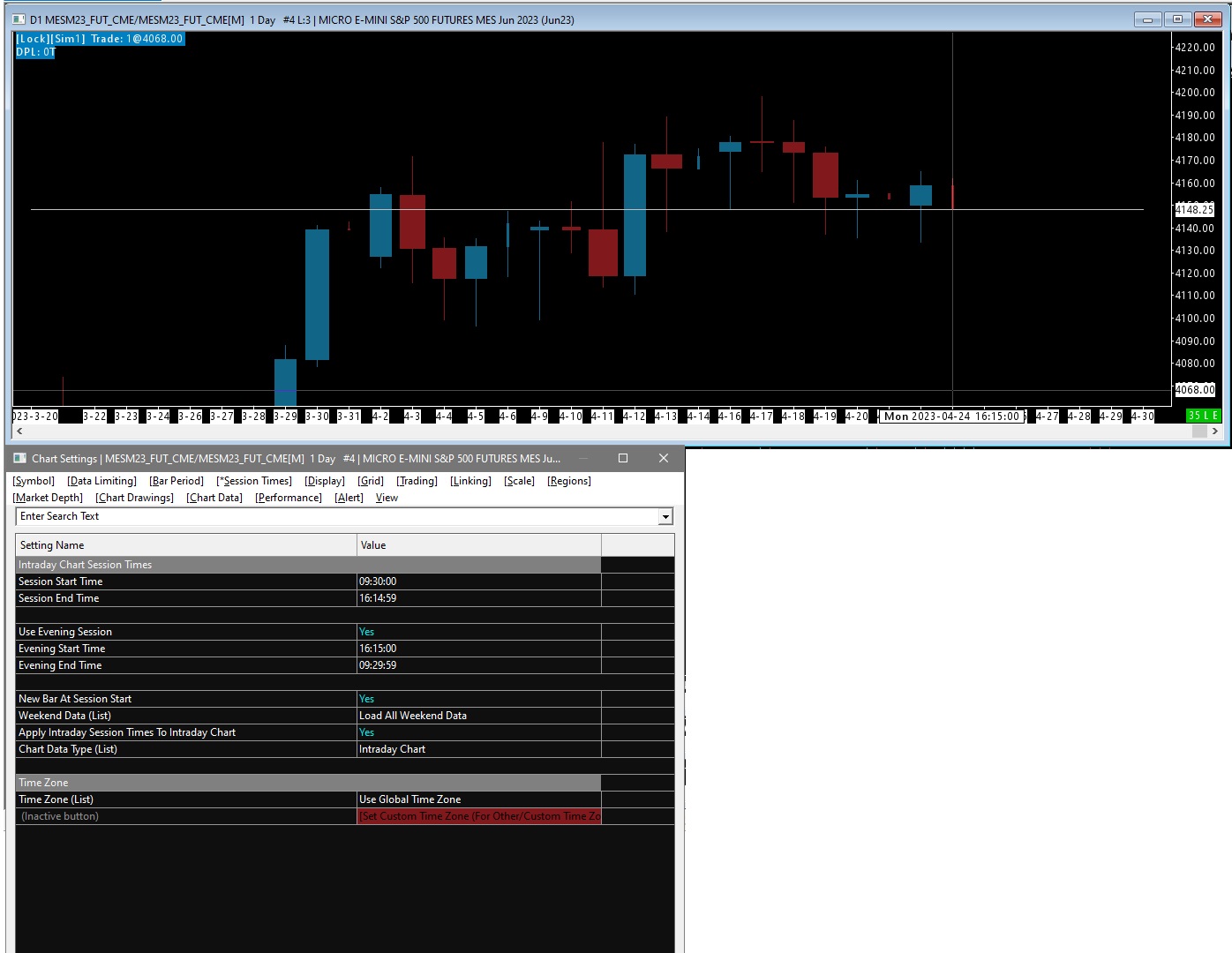 Didn't think of that, so, if the bar duration is 23 hours and 59 minutes, it will cover any products, not just ES, it is a better solution: Bar Period Type: Days-Mins-Secs-Milliseconds Per Bar Bar Period Value: 0-1380-59-999 the value has to be less than 24 hours, otherwise it won't work. @jivetrader, your screen shot shows your value was set to 1-0-0, that has to be changed to 0-1380-59-999 Date Time Of Last Edit: 2023-04-28 00:25:57