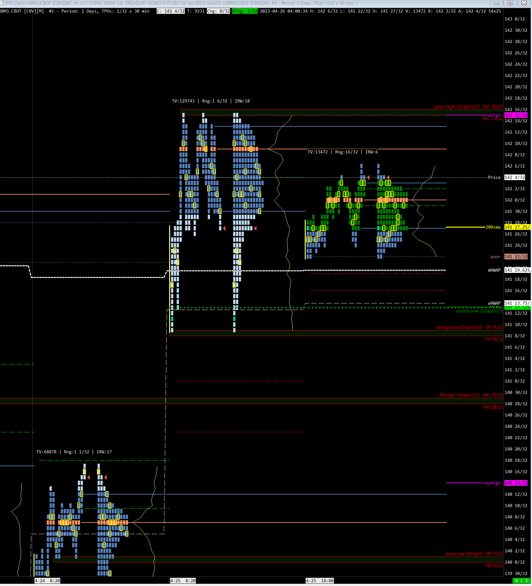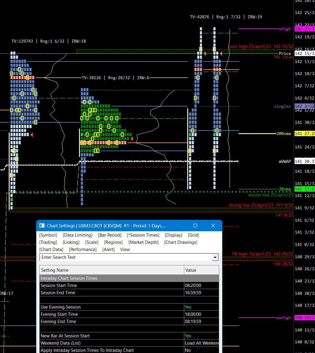 Hello guys, Until before the open of the treasury markets (08:20 ET) my charts (UBM3.CBOT) was displaying just fine, however now I see a wrong profile for yesterday 25th of April, and the Overnight profile is merged with the RTH one, even though I have the settings to only show the last Overnight profile, and start a new one when RTH begins. Im attaching the current view, how it was looking this morning, and some of the settings. I am running version 2492. I tried restarting Sierra, same result after a new start was performed. Also the Delete and Download Data, same result. As you can see comparing the image of this morning, the TPO from yesterday doesnt have a poor low, however the one I see now has a poor low. So it is not only that the Overnight and the current RTH are together, but also the problem with yesterday' data. What can I try out? Thank you! |